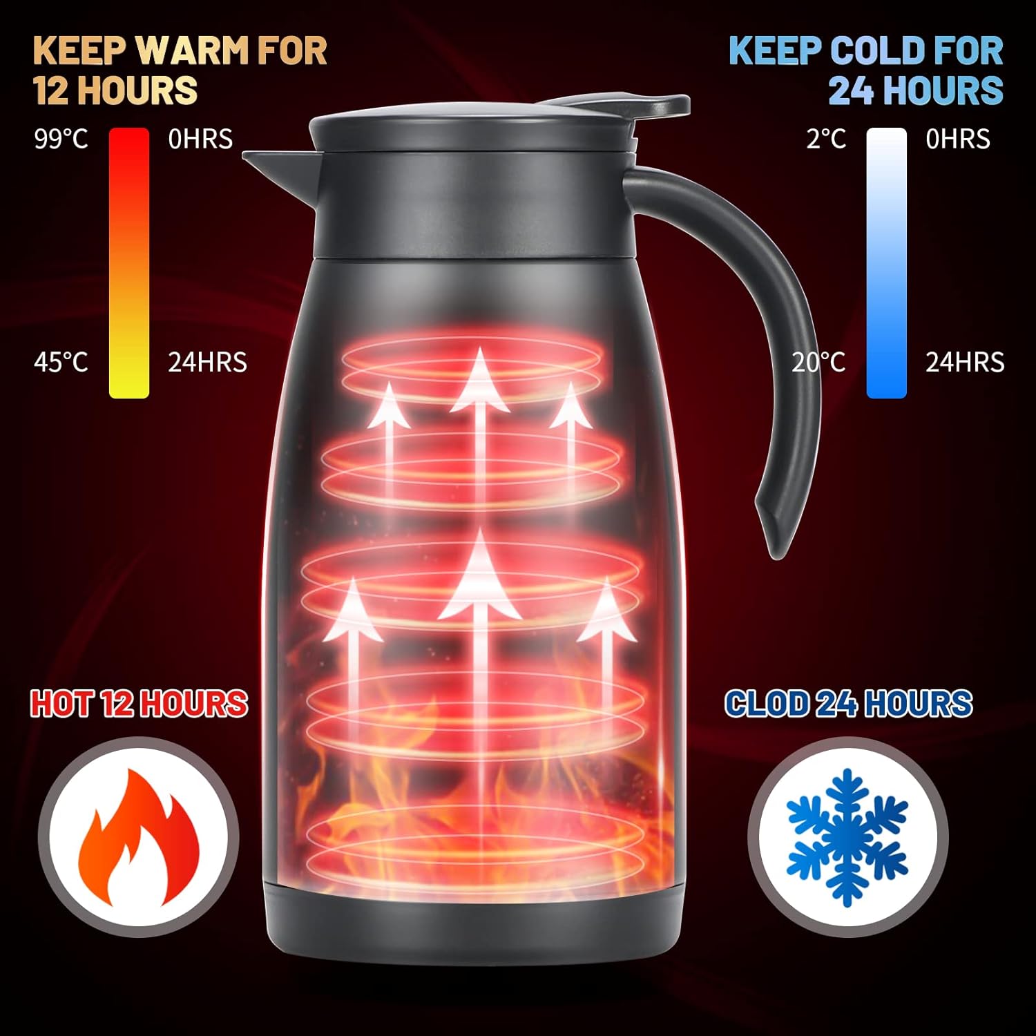 - 12 HOURS HOT & 24 HOURS COLD | This coffee carafe use the insulated vacuum and double walled interior and exteroir technology,ensure that the innner temperature can keep the hot for 12 hours and cold for 24 hours,it can locks in temperature for any beverages and preserve flavour and freshness on any ocaasion.