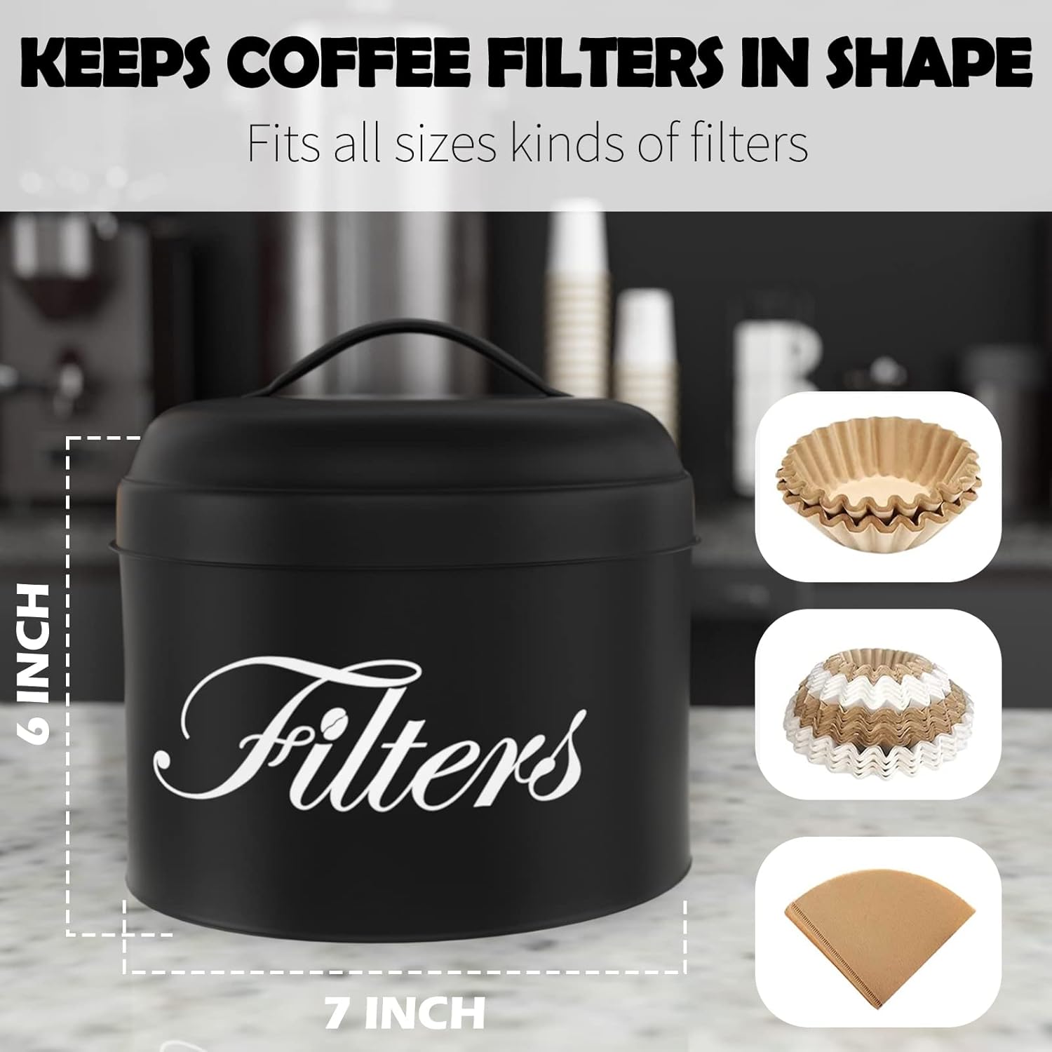 - 【STURDY COFFEE BAR DECOR】 Our coffee filter holder storage is made from food-safe, powder-coated galvanized steel and it won't break after long time of use. Smooth surface are straightforward to clean, wipe with a damp cloth. It is a nice decoration in your Kitchen Counter, coffee bar decor