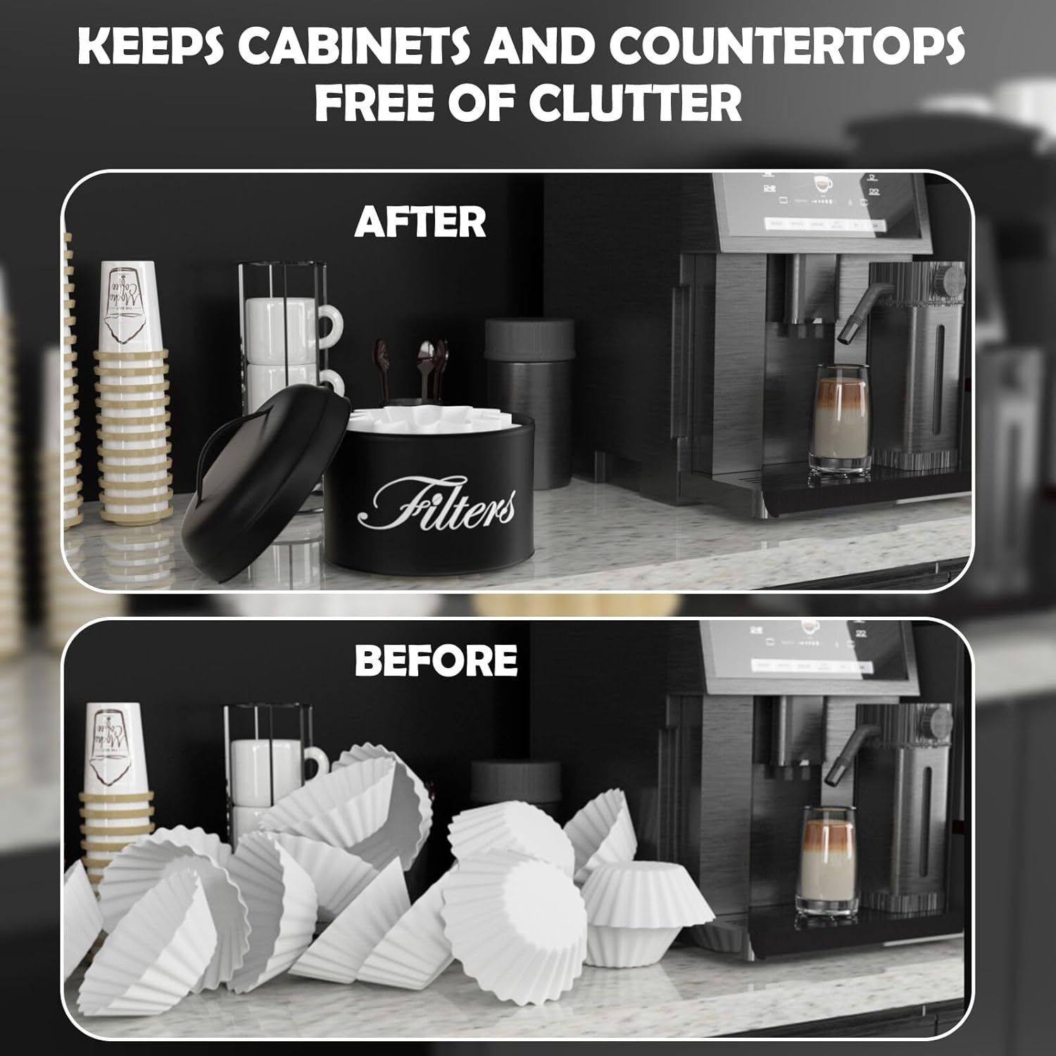 - 【BASKET COFFEE FILTER CONTAINER】 Our coffee filter holder with lid is capable of holding various sizes of round basket-shaped pleated filters commonly found in the market, a sizeable internal capacity is enough to store your daily coffee filters, it is a perfect addition to your coffee bar decor