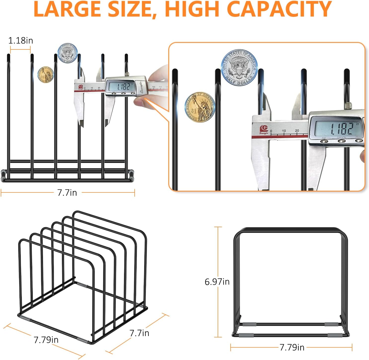 - LARGE SIZE: This bakeware rack is 7.9*7.8*7.1 inch, there are 5 of 1.2 inch compartments, tall and wide enough to hold five cutting boards, bakeware, or more cookie sheets.