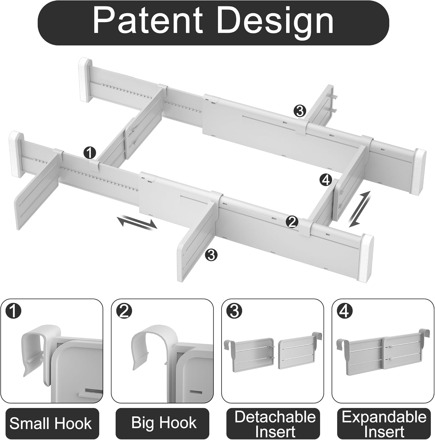 - PERFECT FIT SIZE: Each long divider is 12.6 inches length, 2.36 inches high, the maximum stretching length can reach 22.9 inches, big-hook insert length can expand from 3.5 to 6.3 inches, small-hook insert length can expand from 3.9 to 7.1 inches. All parts of drawer dividers are freely adjustable in length to fit perfectly into every type of drawer