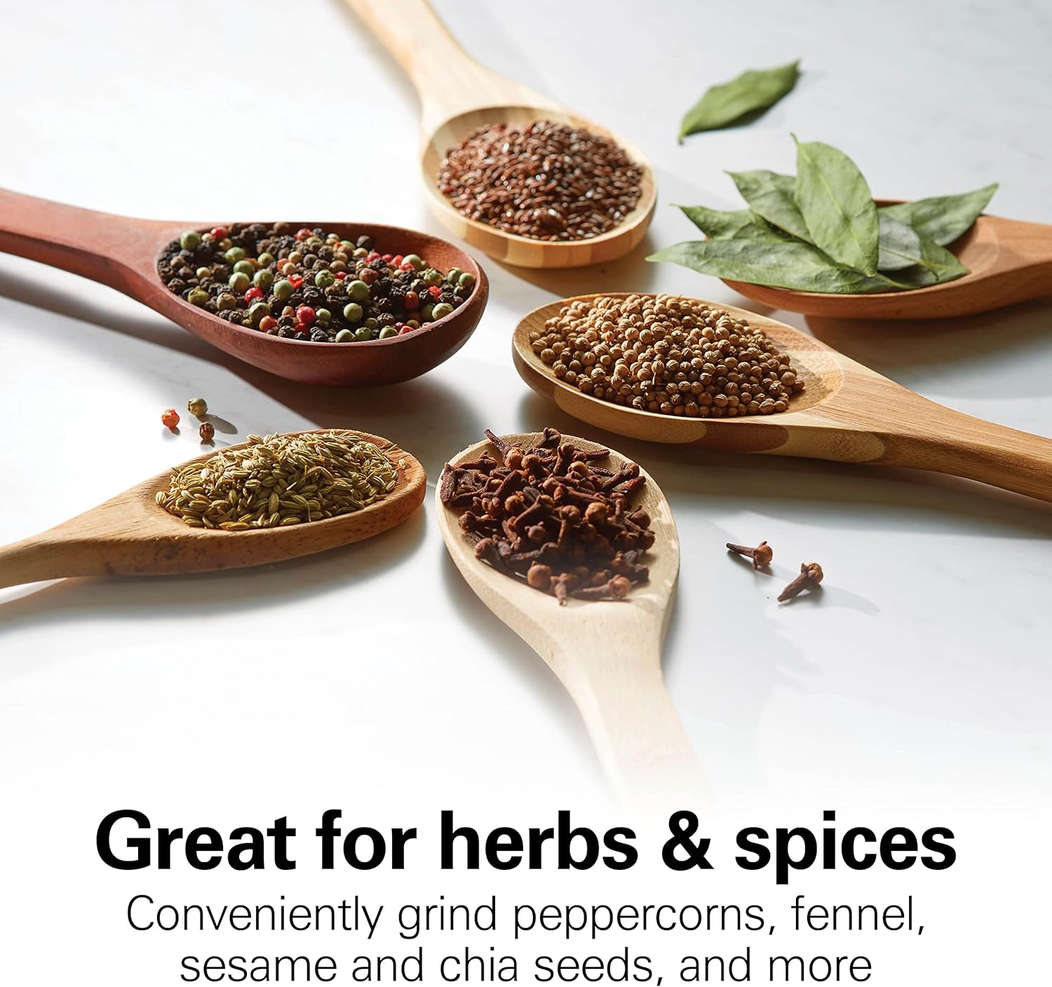 - GREAT FOR HERBS AND SPICES: Conveniently grind peppercorns, fennel and other herbs and spices for recipes or to keep on hand in the kitchen. Also great for grinding sesame, flax, chia and other seeds for smoothies, protein shakes or to add to food.
