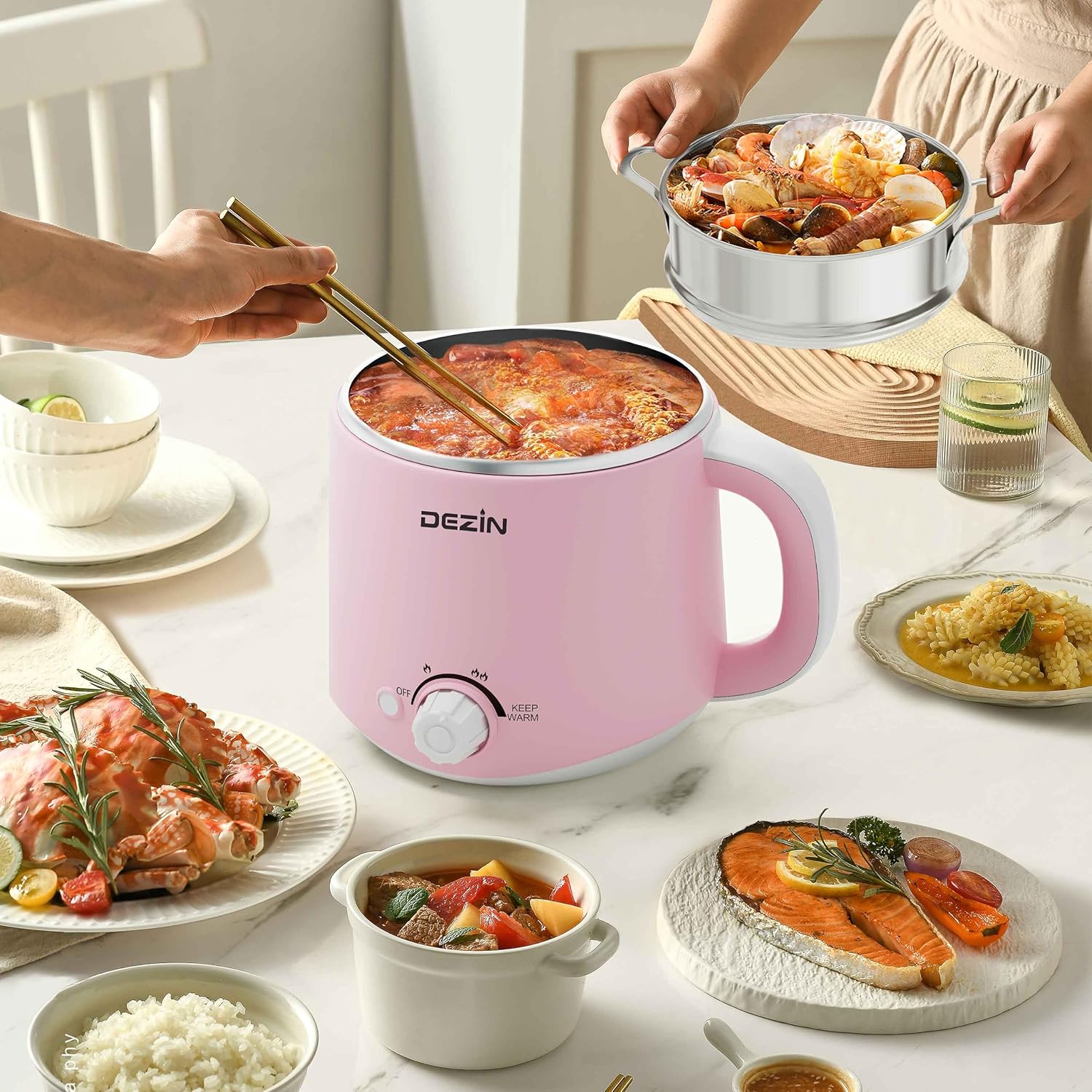 Dezin Electric Pot with Steamer, Hot Pot Electric 1.6L, Stainless Steel Cooker for Ramen, Egg, Dumpling, Soup, Oatmeal with Temperature Control and Keep Warm Function, Pink