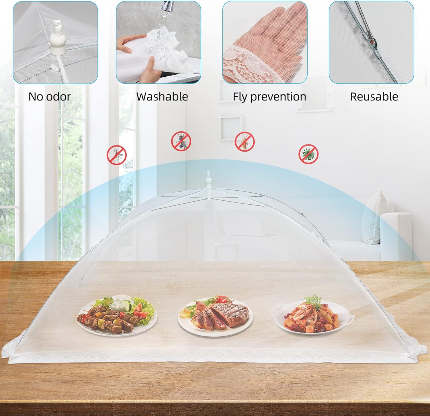 - USE ALL YEAR ROUND, EASY TO STORE: The large food covers for outside is a very ingenious umbrella design, which is very easy to pop up and fold for easy storage, preventing curious cats and children from eating unprepared dishes, and making everything more relaxed and pleasant. Suitable for birthday parties, swimming pool parties, barbecue cooking, camping picnics or DIY outdoor party supplies.