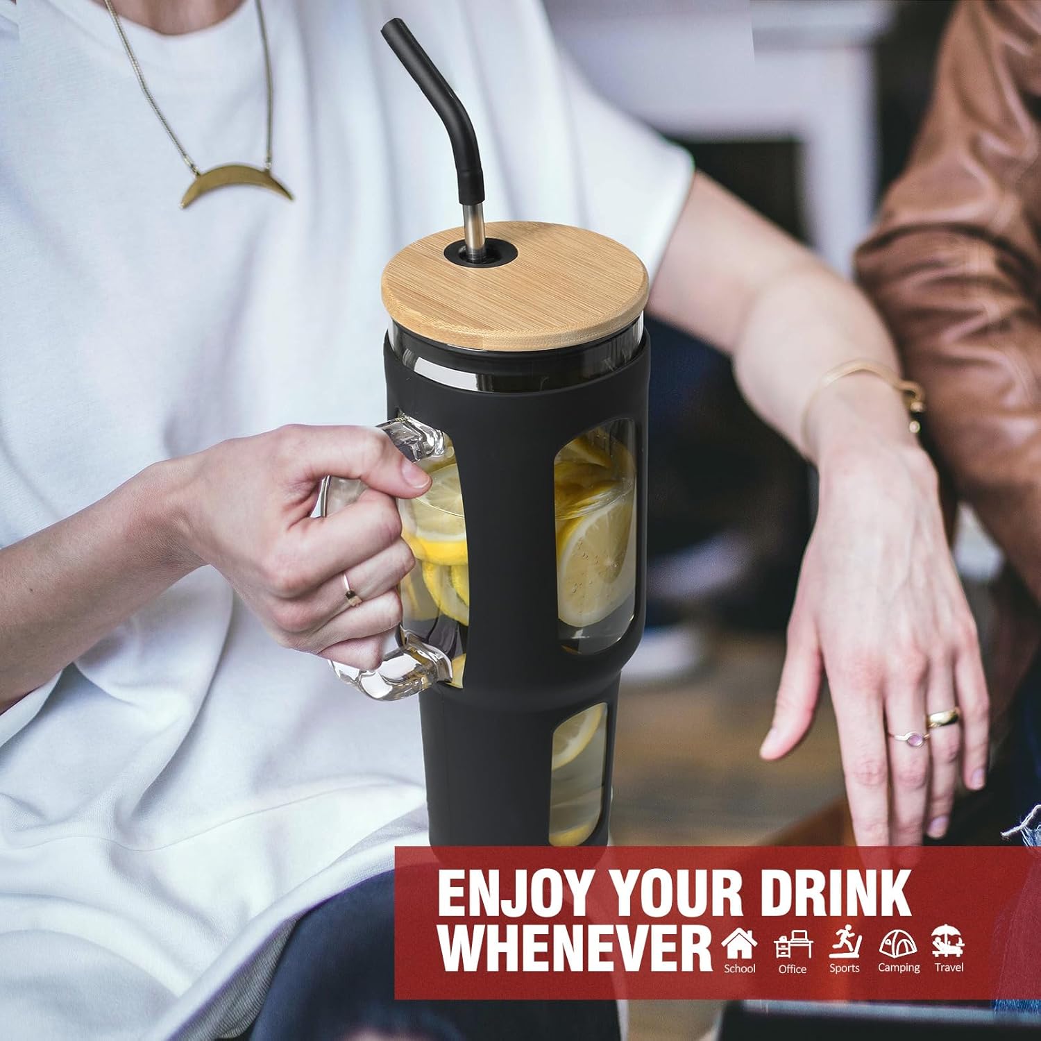 Glass Tumbler with Lid and Straw, 46 oz Iced Coffee Cup with Handle, Large Water Bottles with Silicone Sleeve, Glass Cup with Straws - Pearl Straw & Drinking Straw BPA Free-Black