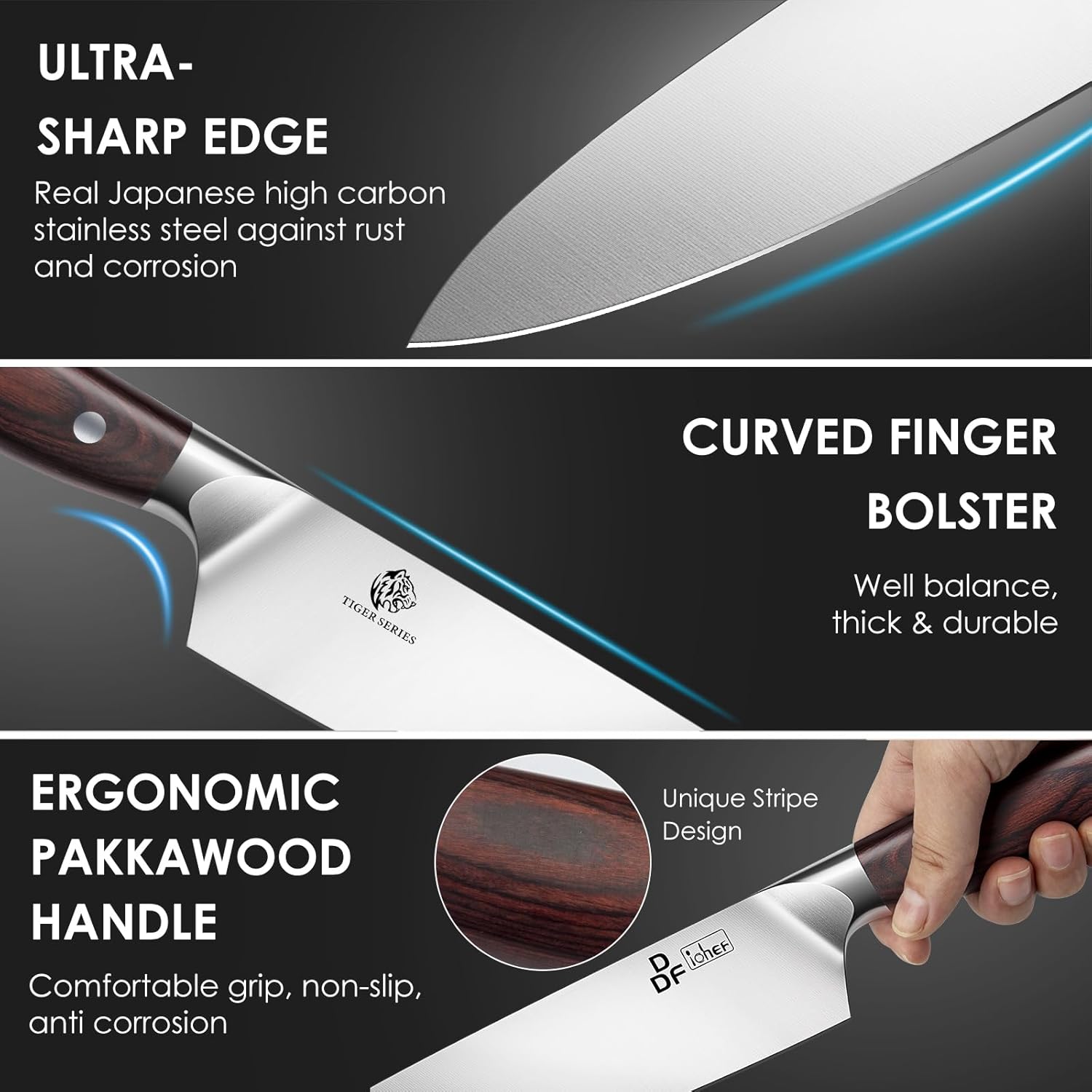 - 【ULTRA SHARP & DURABLE】: The blade of each DDF iohEF knife is constructed from high carbon Japanese steel for excellent protection against rust, and is meticulously hand-polishing and precise tempering technology for long-lasting sharpness and easy honing.