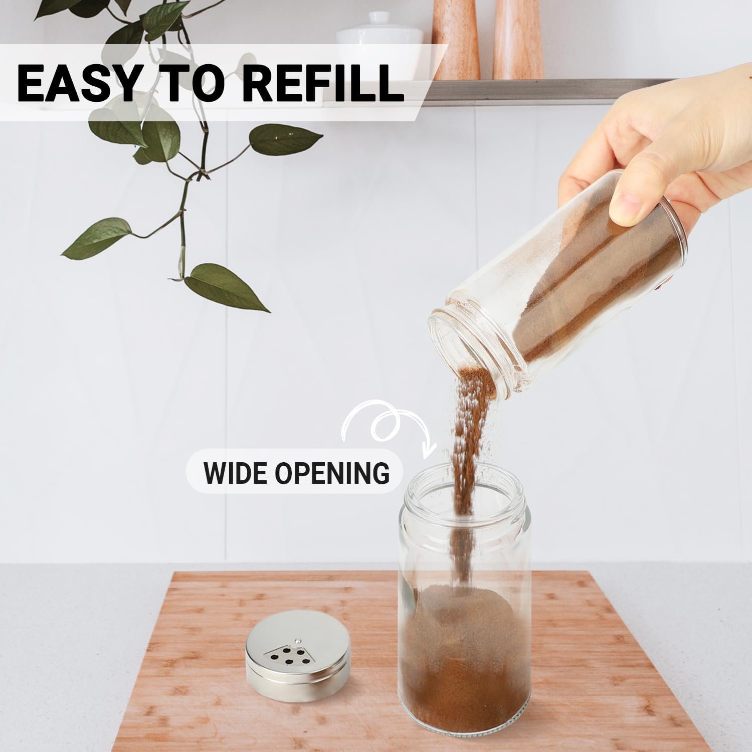 - Sturdy Glass Spice Containers: Our seasoning containers are crafted from high-quality thickened glass, ensuring their durability and sturdiness. Seasoning shakers protects the spices from light, moisture and air, keeping them fresh and flavourful for longer. The transparency of the glass spices jar ensures that you can clearly see the spices in the bottle, so that you can refill it in time.