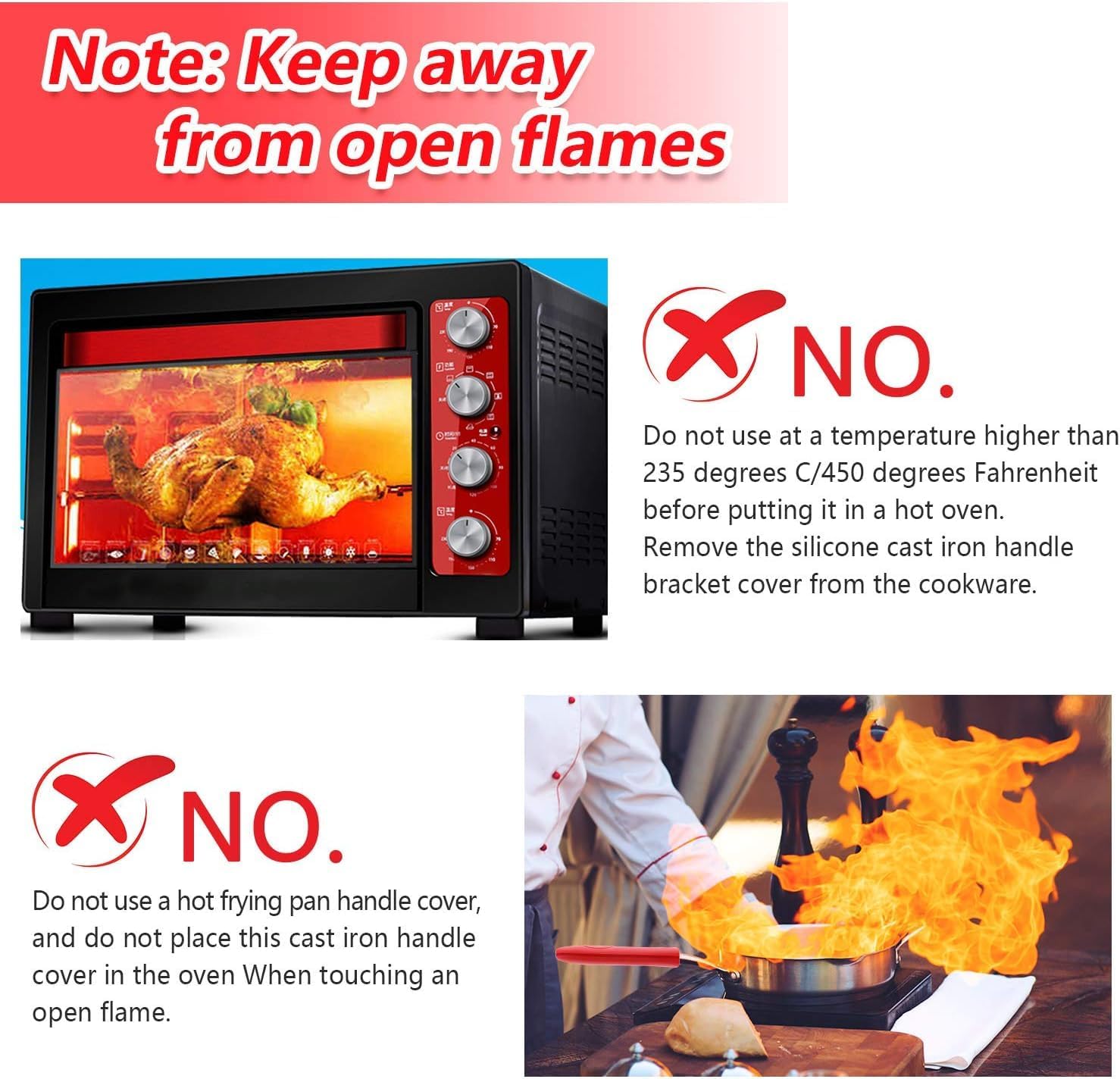 - Note: DO NOT use hot skillet handle cover when coming in contact with open flames, Don't put this cast iron handle cover on while it is in oven. The silicone cast iron handle holder cover should be taken off cookware before put into hot oven. Don't use with temperatures higher than 235 degrees C/450 degrees F
