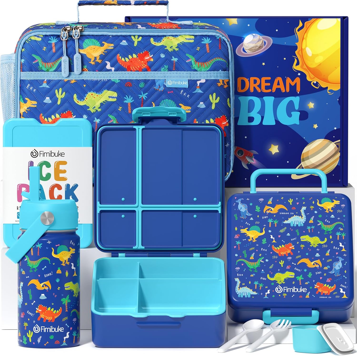 - 7PCS KIDS SCHOOL LUNCH BOX GIFT SET: Fimibuke kids lunch box set provides an one-stop solution for kids school lunch or snacks packing and carrying, this all-in-one gifts box comes with a 100% leak-proof kids bento box, a 14oz water bottle insulated, a kids insulated lunch bag, an ice pack, a sauce jar, a set of utensils and an exquisite gift box. Perfect for ages 3-12 kids to daycare, nursery school, preschool, kindergarten, elementary school, back to school or summer camp with a healthy lunch