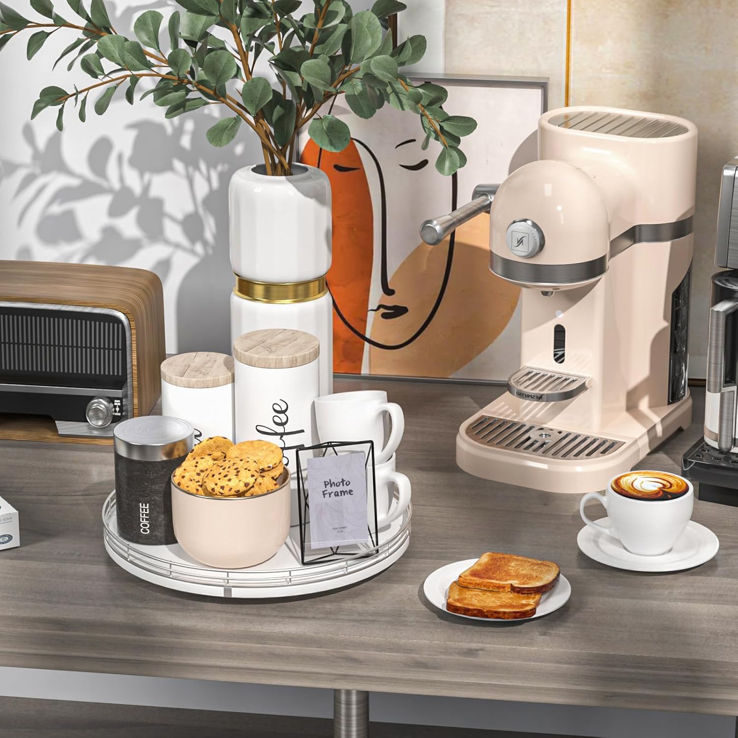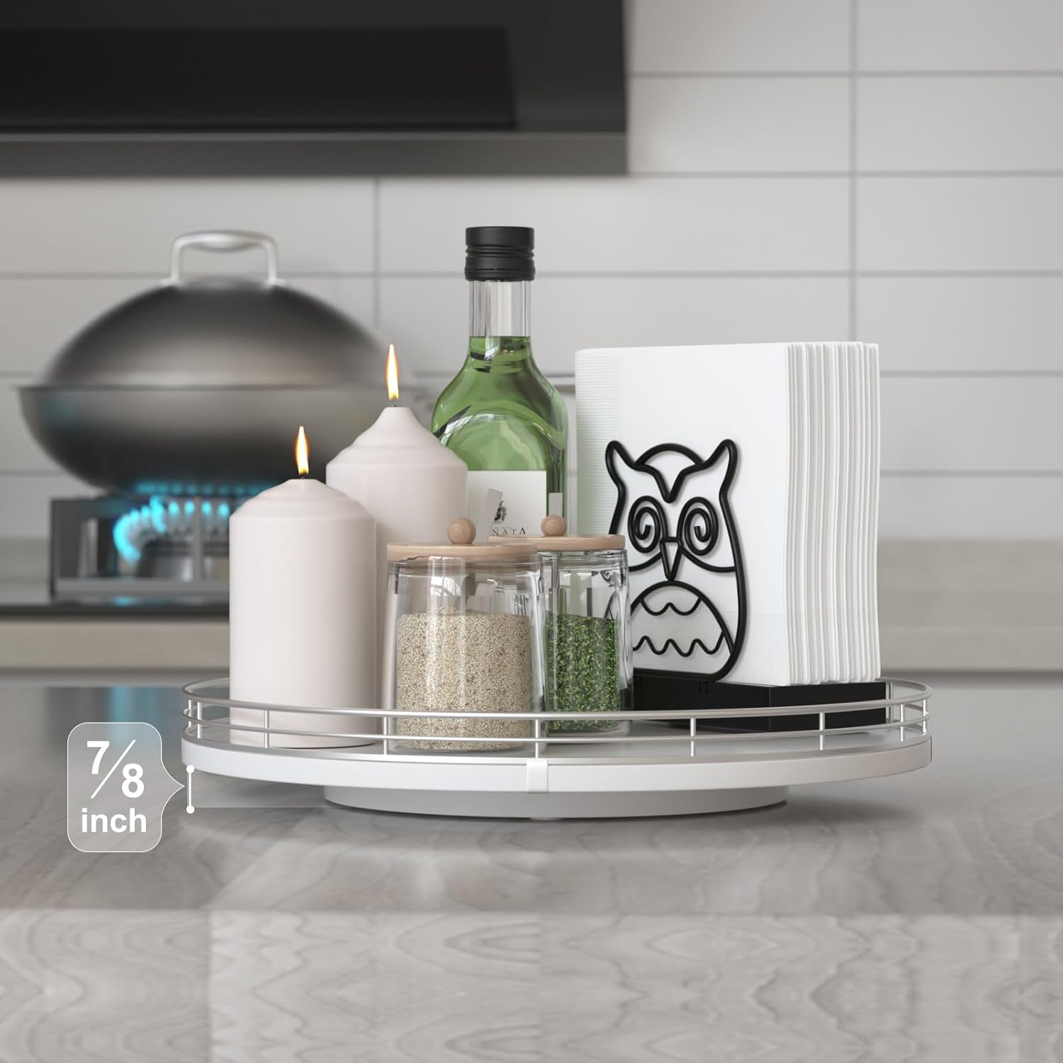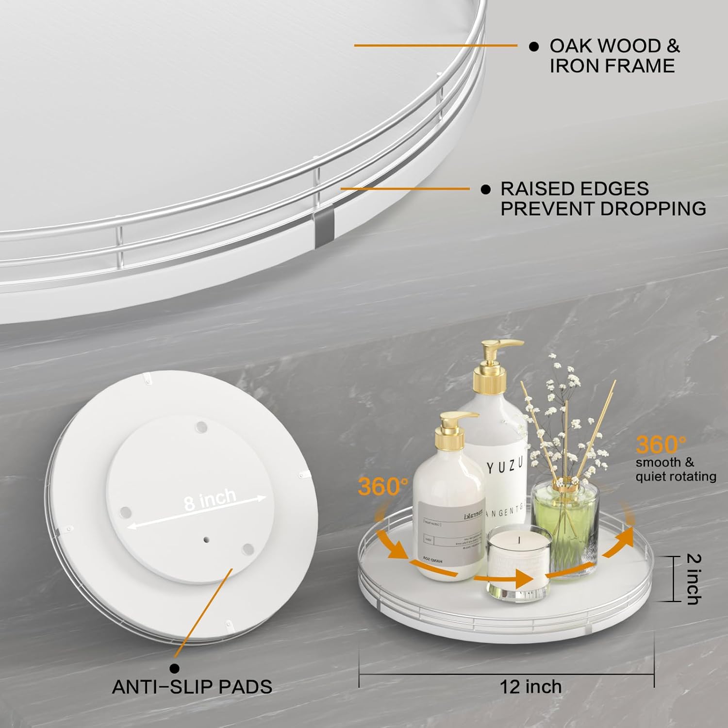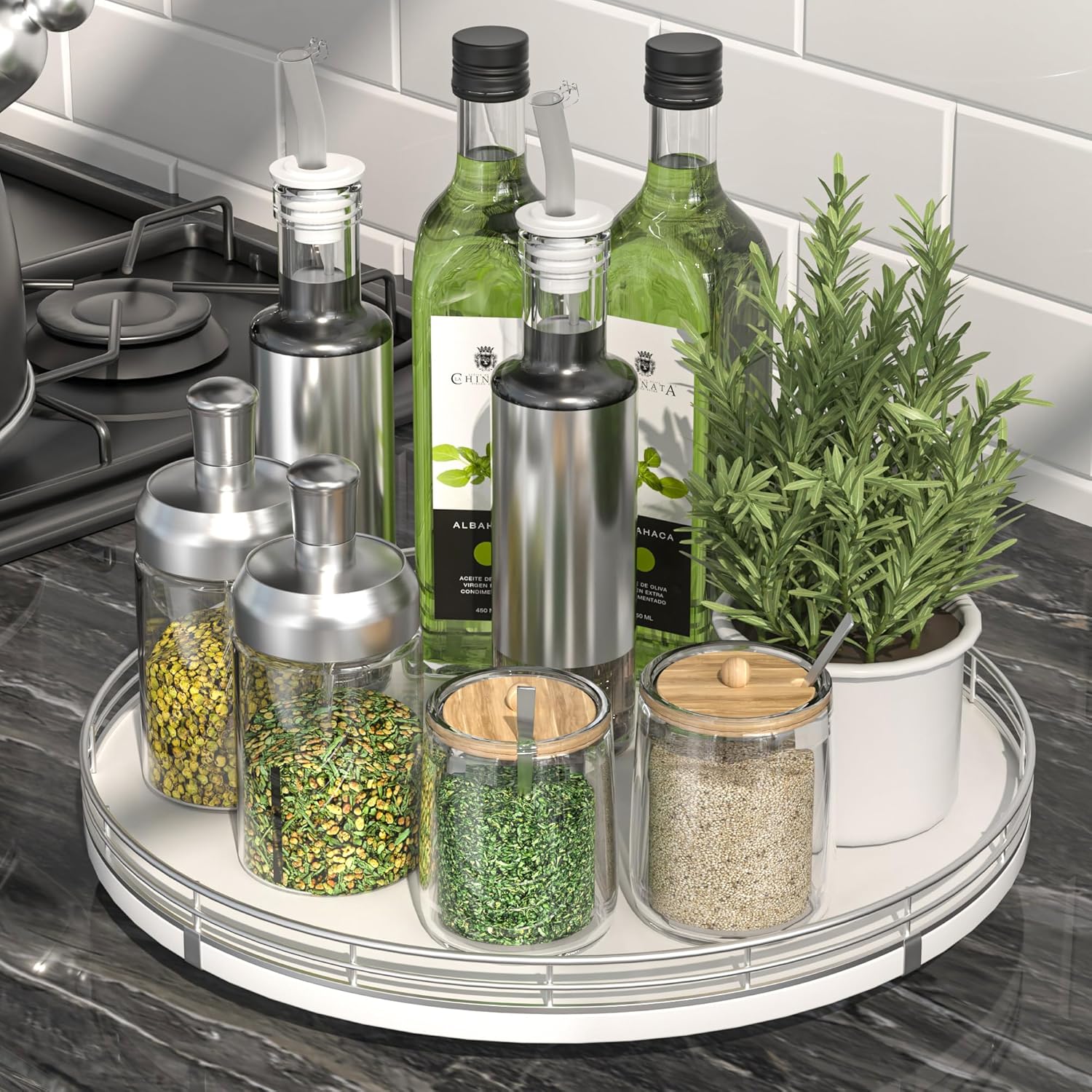 - ๐ง๐ต๐ผ๐๐ด๐ต๐๐ณ๐๐น ๐๐ฒ๐๐ถ๐ด๐ป: The turntable tray features a smooth and silent 360ยฐrotation; Bottom slip-resistant pads for stability and protect your countertop from scratches; Raised edges on each organizer tray to keep items from falling out; Easy to use, no installation required