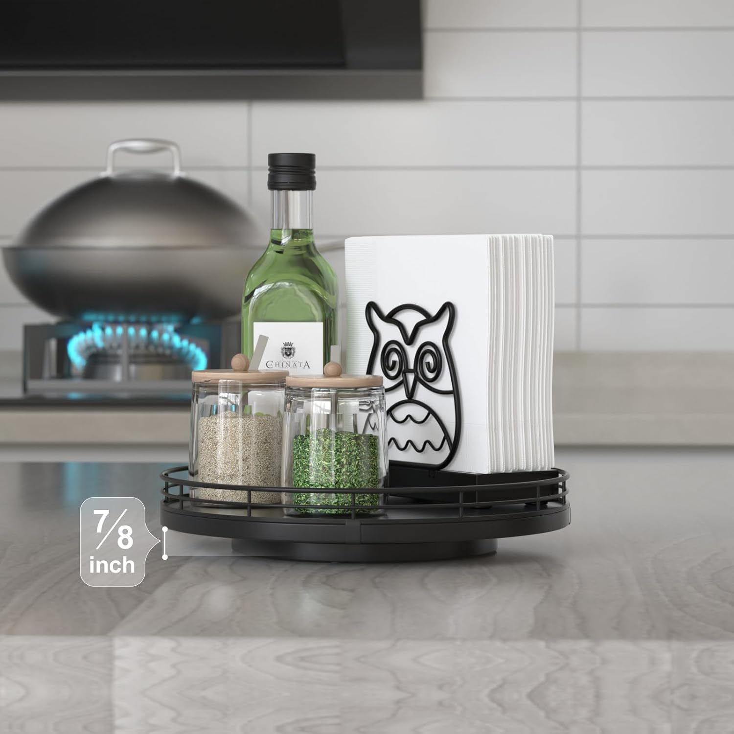 - ๐ง๐ต๐ผ๐๐ด๐ต๐๐ณ๐๐น ๐๐ฒ๐๐ถ๐ด๐ป: The turntable tray features a smooth and silent 360ยฐrotation; Bottom slip-resistant pads for stability and protect your countertop from scratches; Raised edges on each organizer tray to keep items from falling out; Easy to use, no installation required