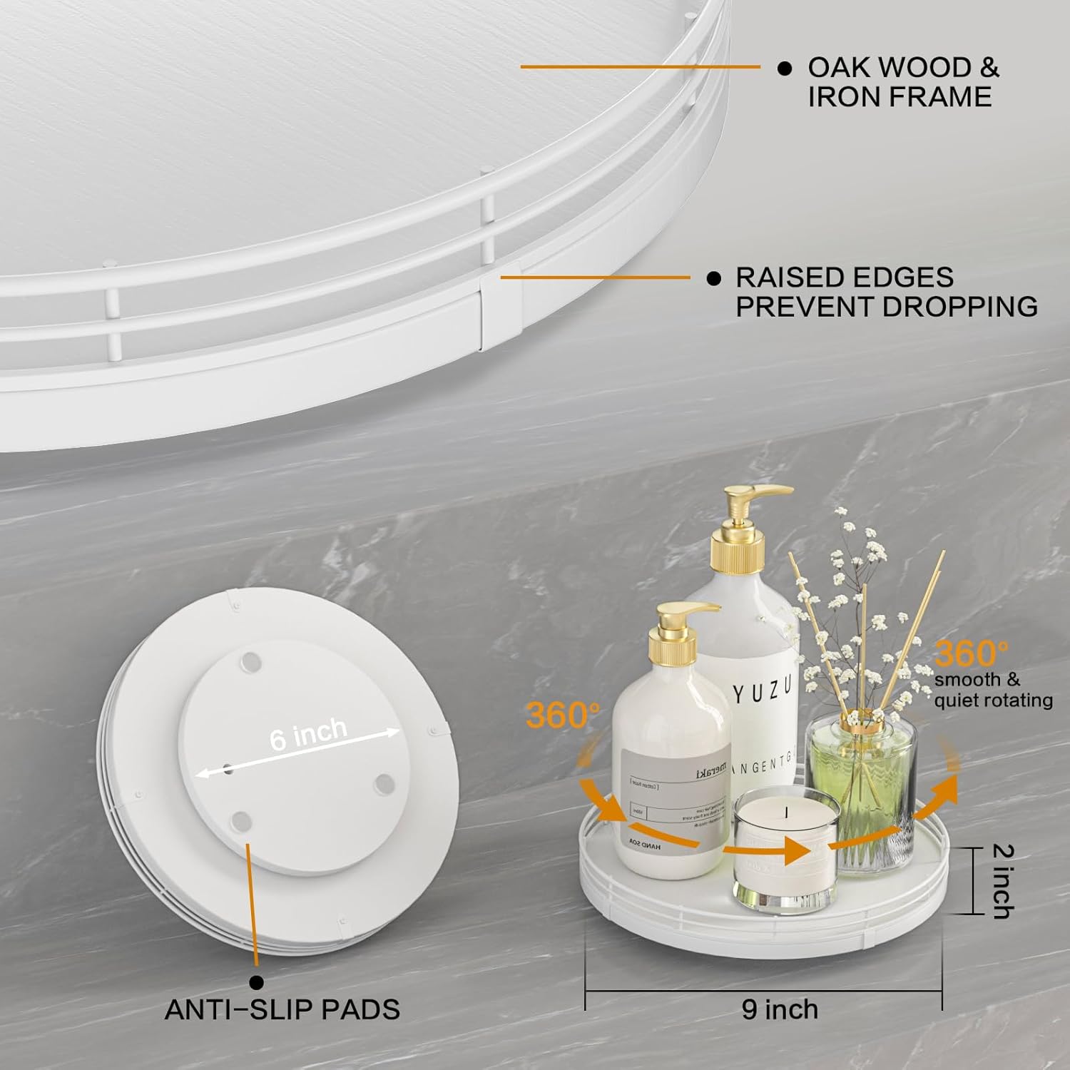 9" Oak Wood Bathroom Tray for Counter, Vanity Tray for Perfume Lotion Candle Makeup Jewelry Sink Soap Holder Turntable Dresser Organizer Countertop Coffee Table Decor Organization and Storage White