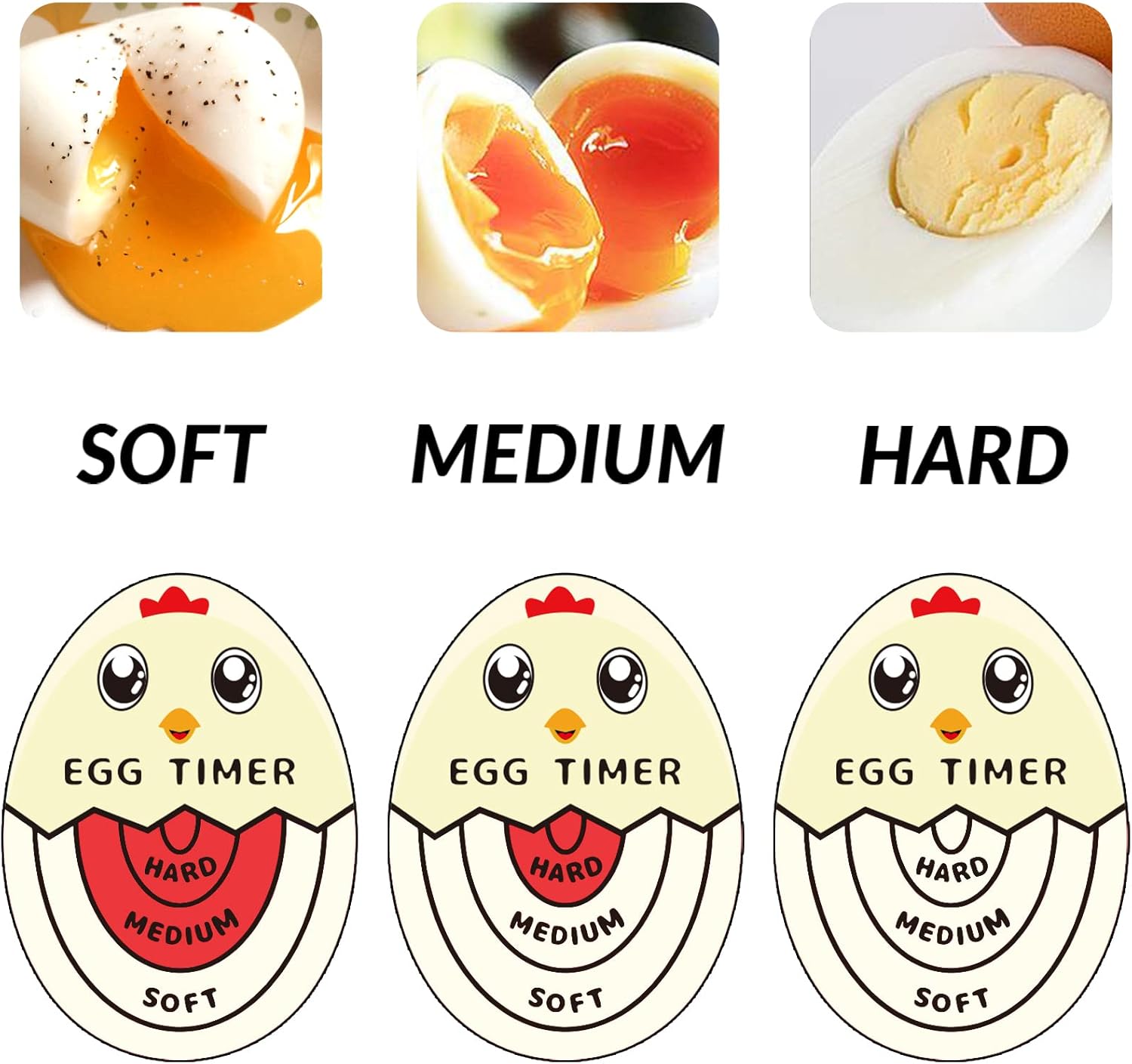 - No more guessing! You just put the boiled egg timer and eggs into the pot and wait. Soft, medium and hard boiled line on egg timer will tell you the doneness degree of eggs.