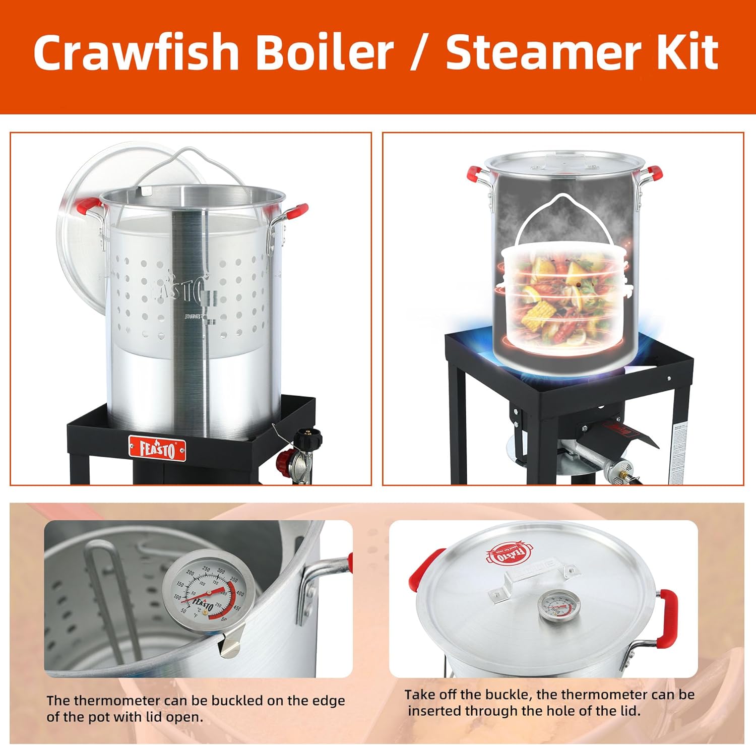 - Product Contains: 30 Qt. Aluminum Turkey Deep Fryer & Seafood Boiler Pot, Lid, Perforated Fryer Steamer Basket, Thermometer, Perforated Turkey Rack, Lifting Hook, Marinade Injector, Gas Stove Burner Stand, Hose & Regulator