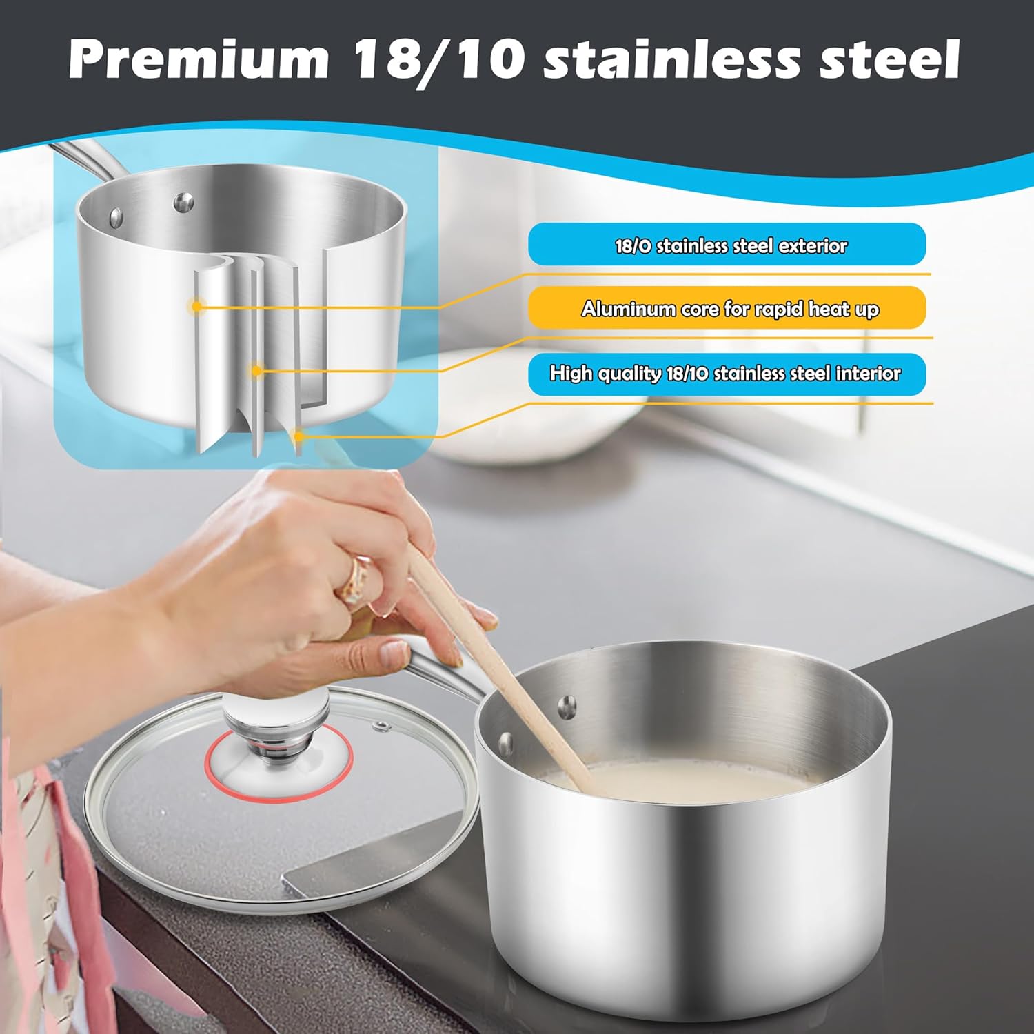 E-far 1-Quart Saucepan, Tri-Ply Stainless Steel Sauce Pan with Glass Lid, Small Cooking Induction Pot Compatible with All Cooktops, Non Toxic, Oven & Dishwasher Safe