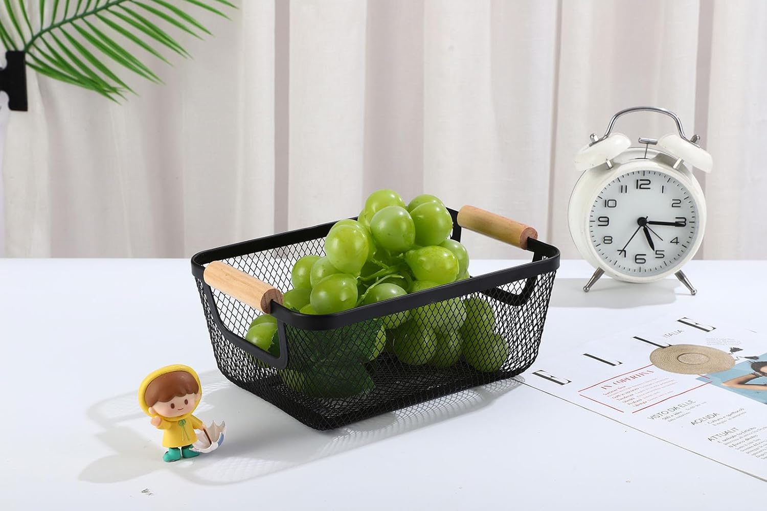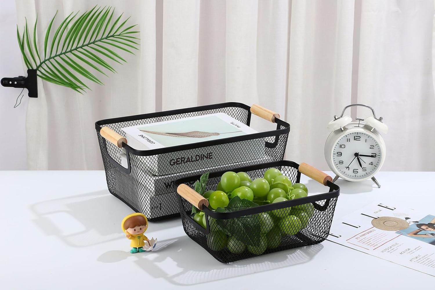 2 Pack Metal Mesh Steel Basket, Small Wire Storage Organizer Basket Multi-function Hanging Kitchen Basket Fruit Baskets with Wood Handle for Kitchen Picnic Cabinet Home Decor, Rectangle-Black
