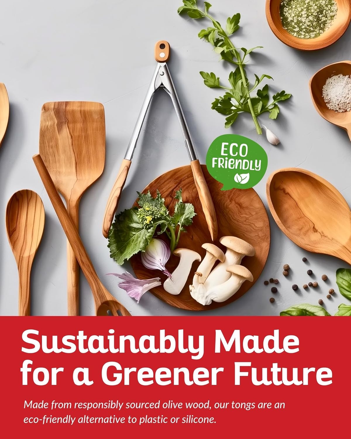 - NON-TOXIC NATURAL OLIVE WOOD: Boxiki Kitchen wooden tongs are made from food-grade natural olive wood and stainless steel. The combination of thickened stainless steel and natural olive wood enhances strength and durability, making them safe and convenient for cooking.
