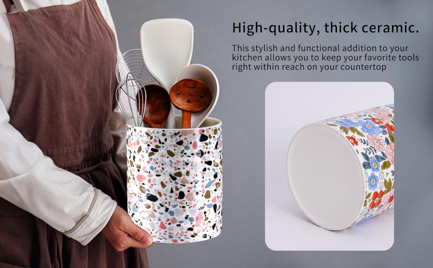 Kitchen Utensil Holder,7.2″Extra Large Stable Terrazzo Marble Pattern Ceramic Utensil Crock,Utensil Organizer for Countertop,Kitchen Decor,Utensil Holder for Housewarming,Wedding Gift Pink