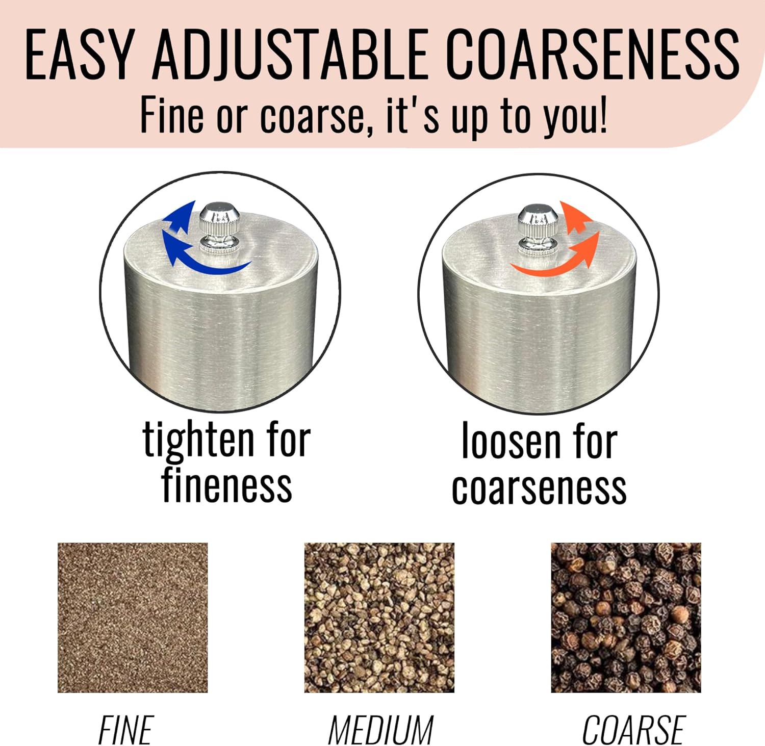 - ADJUSTABLE COARSENESS - Our twist salt pepper grinder set has an adjustable ceramic grinder head. Simply Twist the Top Knob to adjust to your preference. Tighten for Fine Spices and Loosen for Coarse Spices.