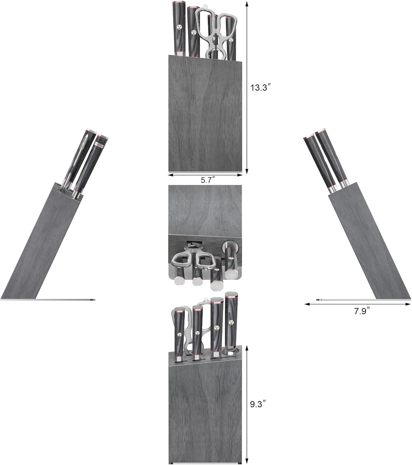 - Set Includes: 9" Honing Steel, 8" Chef’s Knife, 5" Serrated Utility Knife, 3.5" Paring Knife, 9" Come-Apart Shears, and Ash Knife Block