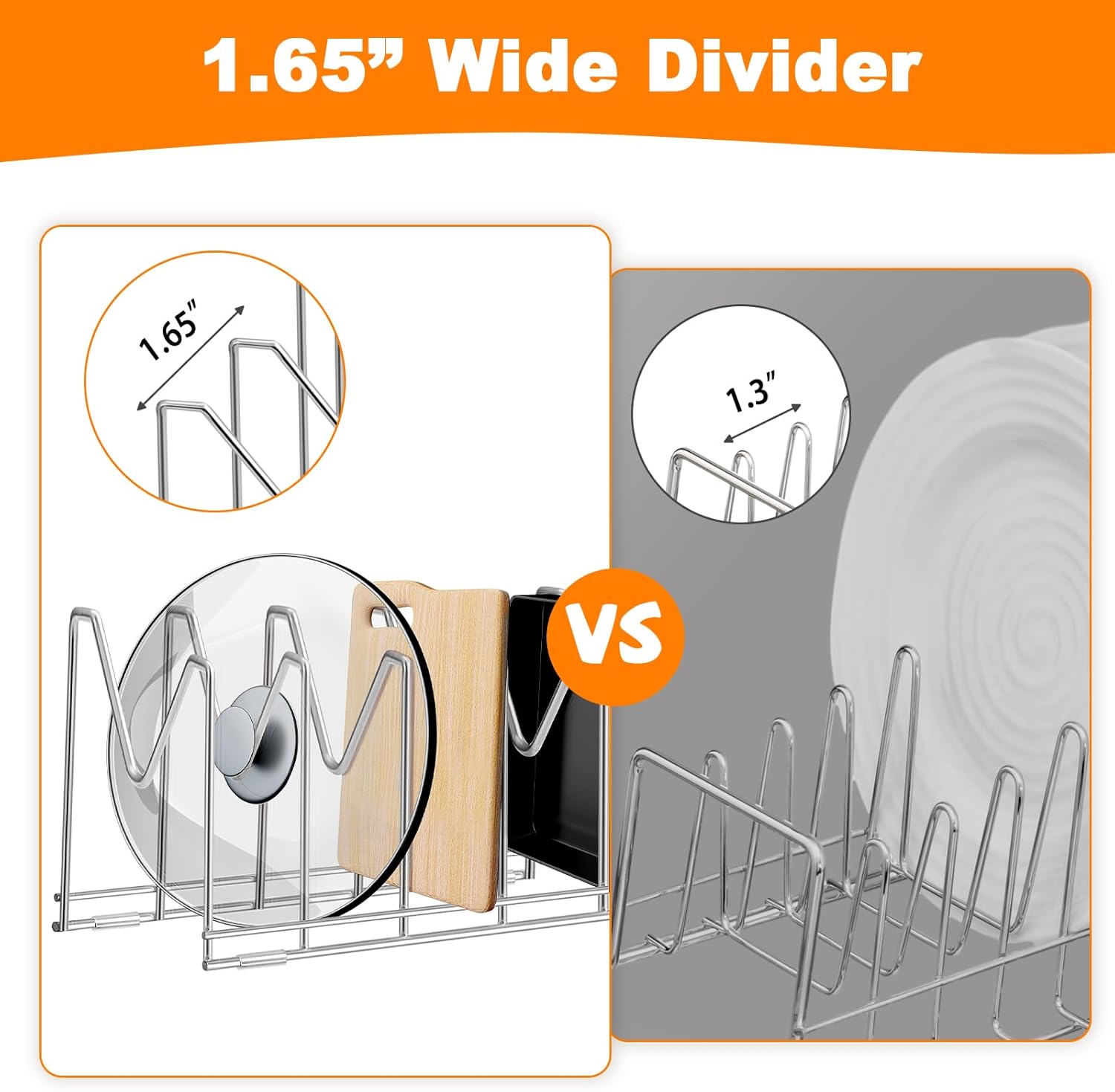 - SUPER WIDE DIVIDER: Each lid holder features five 1.65-inch wide dividers, allowing for organizing various sizes of kitchen or office supplies. Suitable for plates, cutting boards, bakeware, pots, pans, cookie sheets, books, CDs, and files.