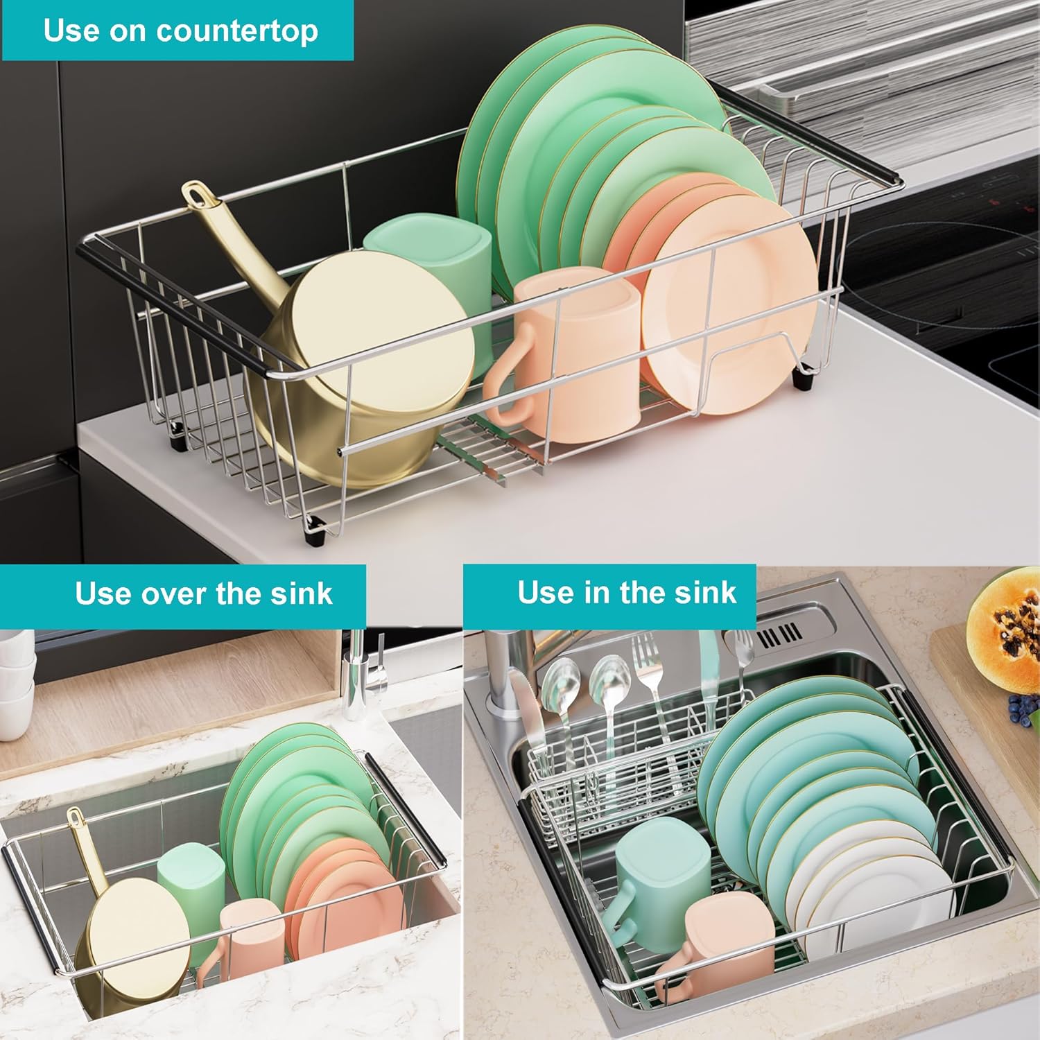 - β 3-in-1 FUNCTION - This dish drying rack expands for use on the counter, in the sink or over the sink. Non slip rubber arms and feet protects the counter and sink from scratches.