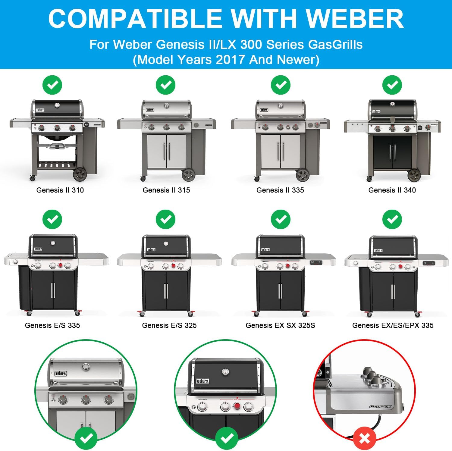 - 【Compatible with Weber GS4 Genesis 300 II & II LX 300 Series】6788 Full-Size Griddle Perfect for Weber Genesis II E-310/315/325/330/335, S-310/335 and More. Griddle for Weber Genesis II LX E-340/S-340, Genesis II S-310 (2017), Genesis II E-310/335 (2019) gas grills.Full Size Griddle for Weber Genesis ii 300 2016 and newer modle: Genesis ii CSE-315/CSS-315/CSS-3.【Compatible with Weber Genesis 2022 Series 】Full-Size Griddle for Genesis E-325s/S-325s/EX-325s/EX-335/SX-325s/SX-335/E-335/S-335/EPX-335/SPX-335.