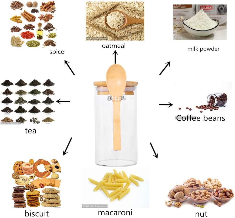 - [Highly Glass] The glass jars with bamboo lids and spoon are made of high-quality borosilicate glass and BPA free silicon which withstand temperature 0℉ to 400℉, you can put this airtight food canister in the pantry, kitchen corner or fridge.