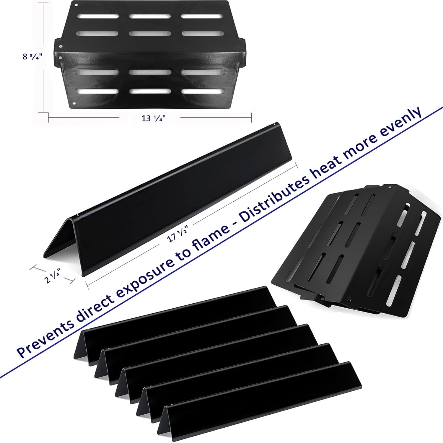 - 【DIMENSIONS】13 1/4 (L) x 8 3/4 (W) inches of heat deflectors, 17 1/2 x 2 1/4 x 2 3/8 inches of flavorizer bars. 【PACKAGE】Package includes 4pcs 304 stainless steel burner tube, 5pcs porcelain enameled steel flavor bars and 2pcs porcelain enameled steel heat deflectors