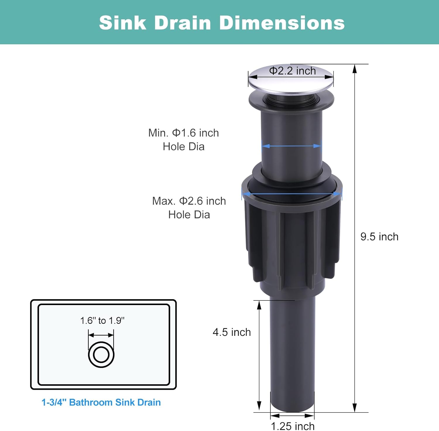 - 【Standard 1 3/4" Drain Opening】This bathroom sink drain fits sink holes with a diameter of 1.6" to 1.9" and is for sinks with a maximum thickness of 1.7". Made for bathroom sinks without overflow.