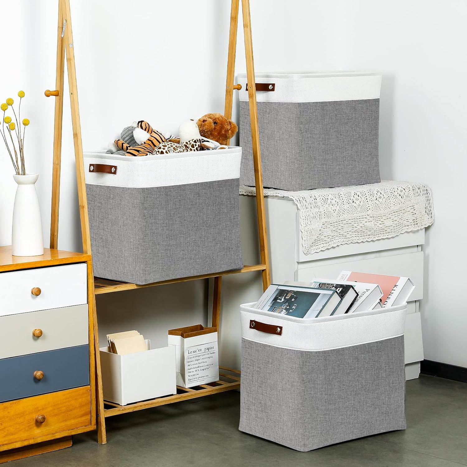 - 【Unique Design & Modern & Decorative】Set of 3 large storage baskets, dimensions(each): 17(L) x 12(W) x 15(H) inches. Collapsible storage baskets bring you organizing convenience and a sweet home. Great for socks, underwear, books, magazines, toys, baby clothes, pet products, wipes, towels, decorations, office supplies, DVDs, and gifts. The fabric baskets with neutral colors can match a lot of home styles - keeping your home nice and tidy.