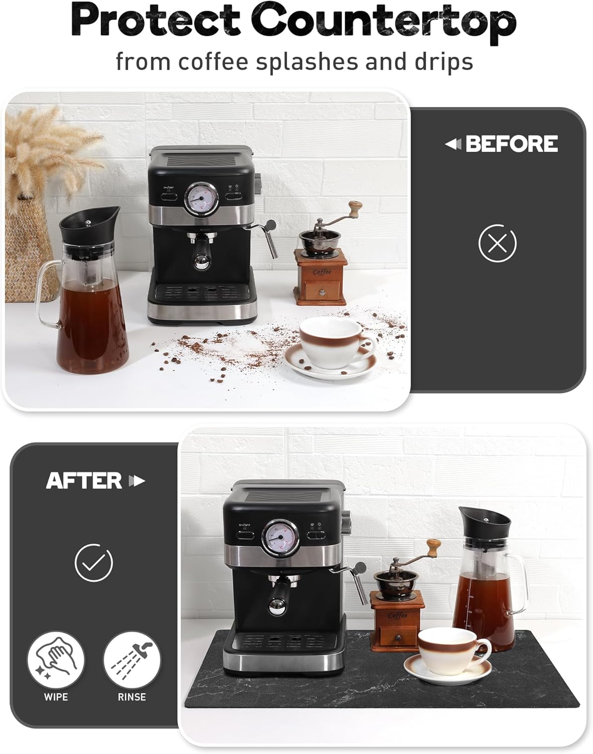 - Easy To Clean - Featuring a PU leathaire surface, this coffee mat is both stain-resistant and easy to maintain. You can simlpy wipe up the spills and grounds, or give it a quick rinse, and the mat will look as good as new. It provides excellent protection for your countertop against splashes and drips, effectively keeping it free from coffee stains.