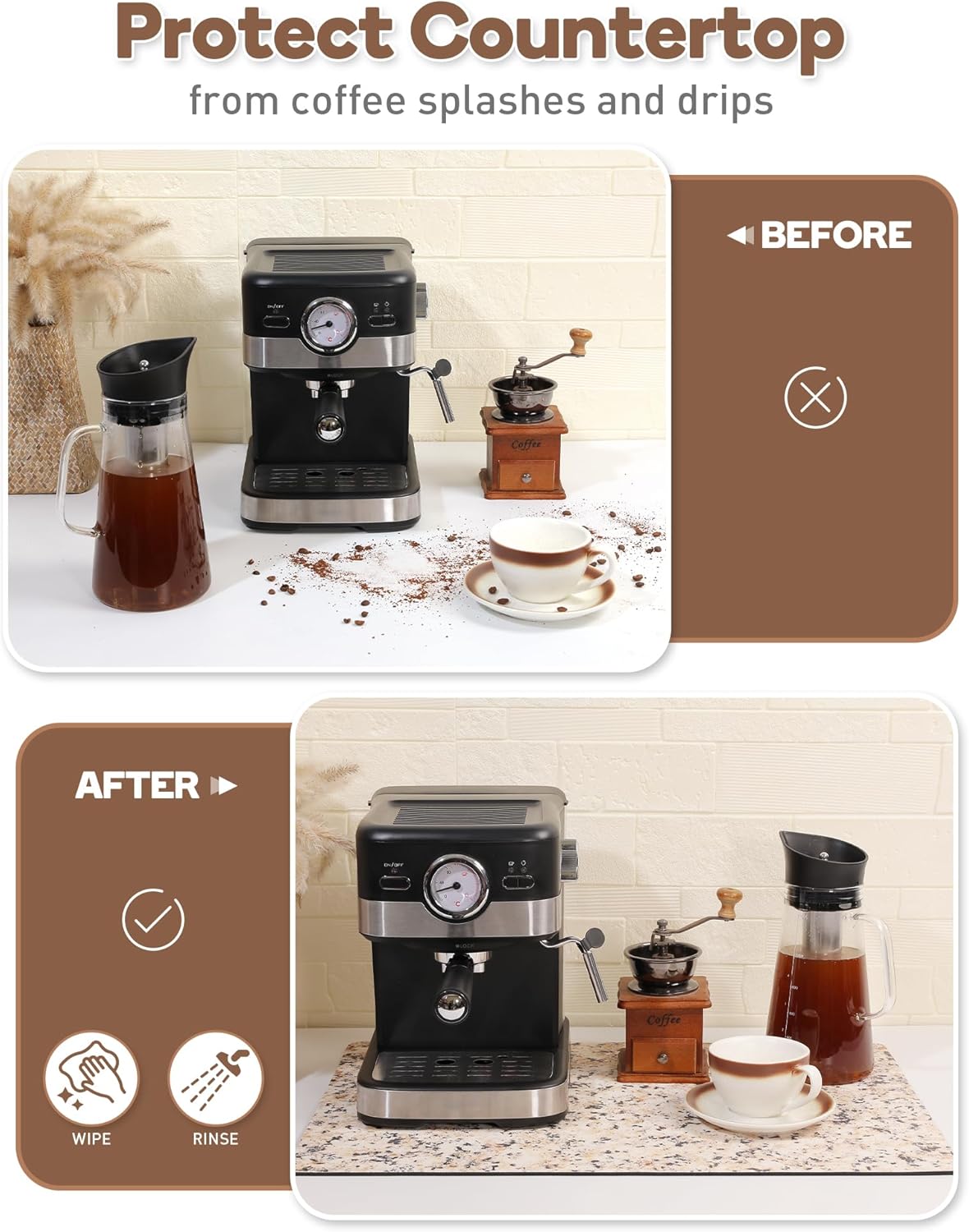 - Easy To Clean - Featuring a PU leathaire surface, this coffee mat is both stain-resistant and easy to maintain. You can simlpy wipe up the spills and grounds, or give it a quick rinse, and the mat will look as good as new. It provides excellent protection for your countertop against splashes and drips, effectively keeping it free from coffee stains.