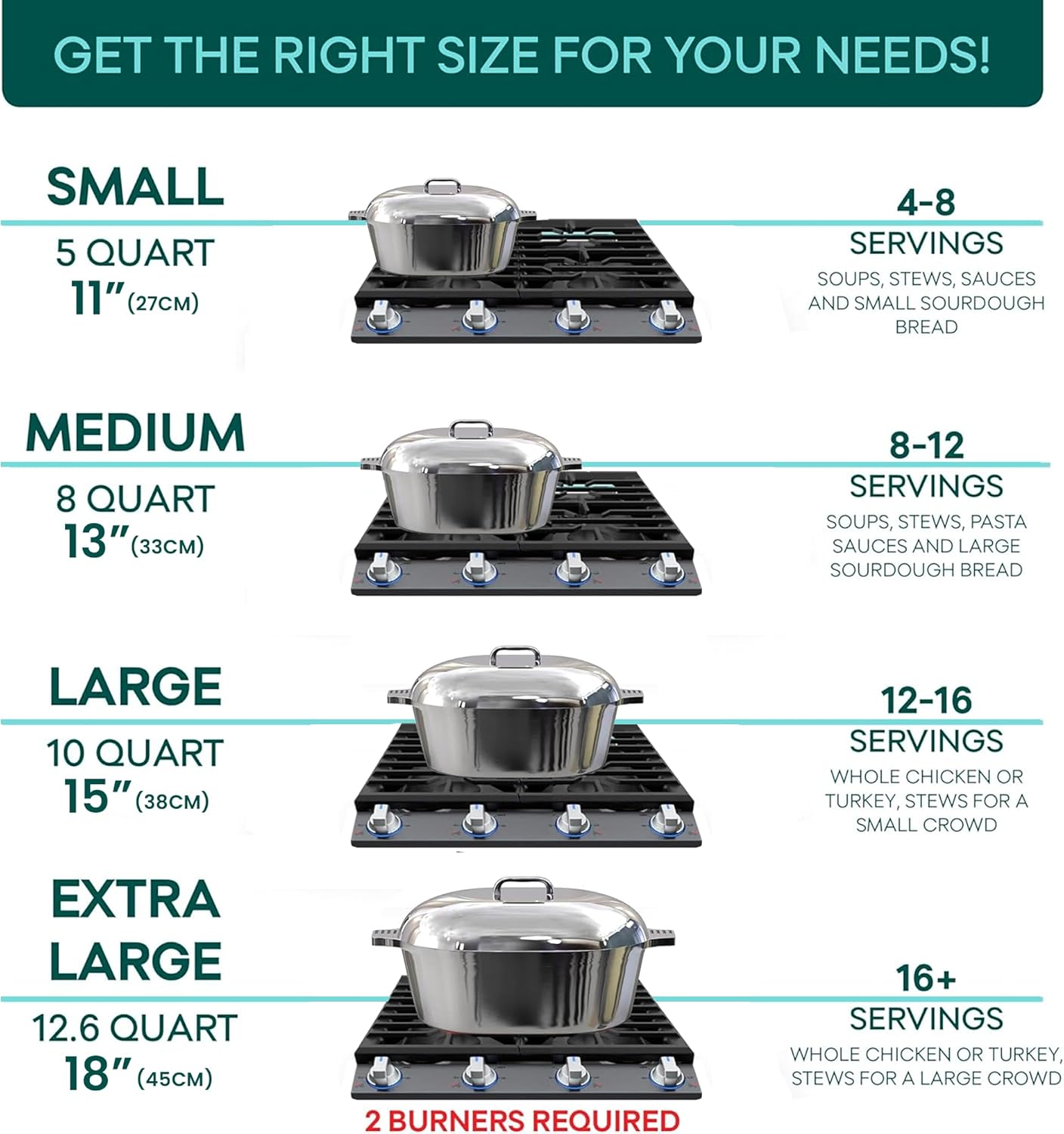- DESIGNED FOR ALL CULINARY NEEDS: Available in four sizes — including 11" Small, 13" Medium, 15" Large, and 18" X-Large — this oval Dutch oven pot with lid caters to various family sizes and cooking preferences. Each set includes protective silicone handle covers and a stainless steel roasting rack for added convenience.