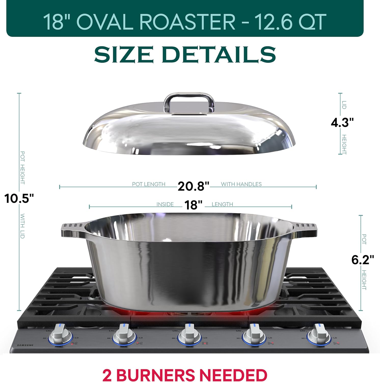 Cast Aluminum Oval Dutch Oven with Lid — 12.6 QT Heavy Duty Roaster Pan with Rack & Silicone Cover Dual Handles — Cajun Cookware for Roasting, Baking, Cooking (18" X-Large)