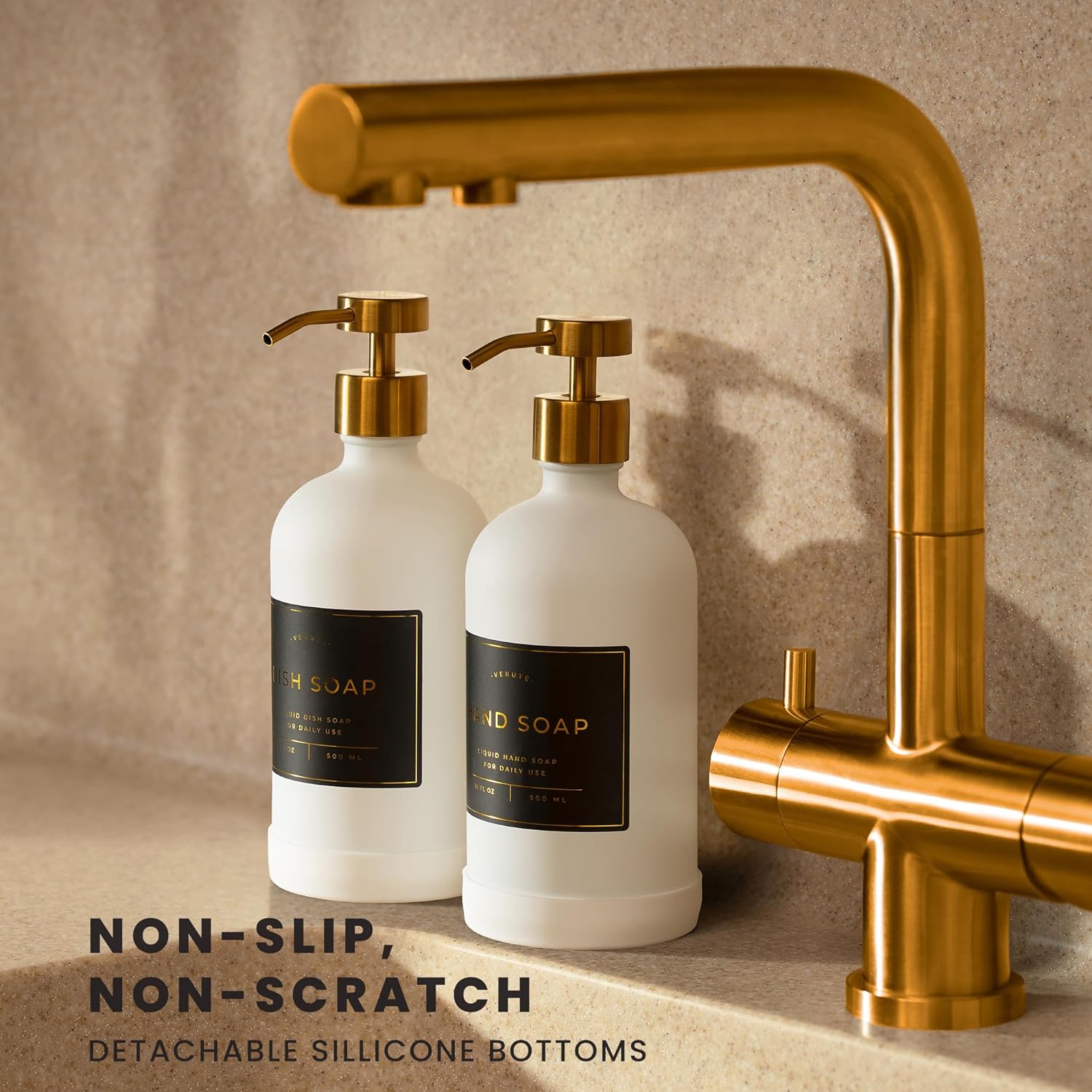• DISPENSING MADE EASY - Fill these kitchen sink bottles with your products and dispense them with one press. Our containers have a brushed gold stainless steel pump that allows liquid to flow smoothly.