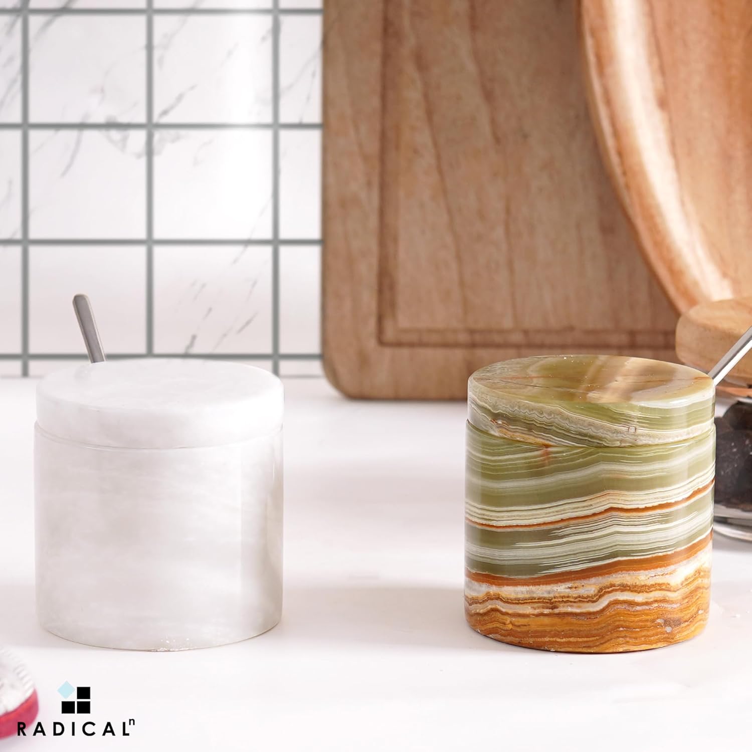 Radicaln Marble Salt Cellar With Lid and Tray 3" Inch White and Green Set of 2 Salt Container for Living Room, Ideal Salt Bowl For Kitchen countertop