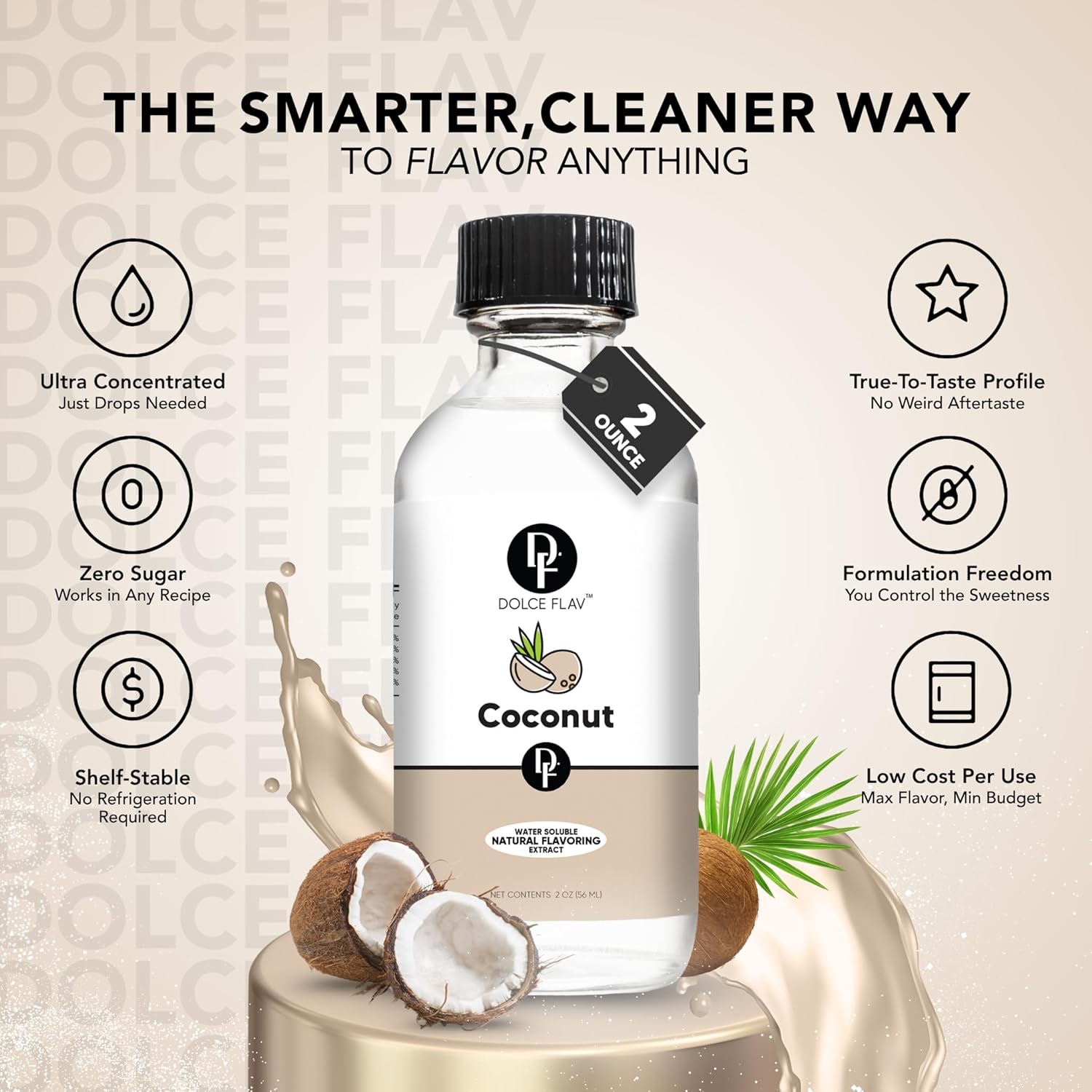 Dolce Flav Natural Coconut Extract – 2 Ounce Water-Soluble Kosher, Sugar-Free, Concentrated Tropical Coconut Flavoring for Baking, Beverages & Desserts, Includes Measured Dropper