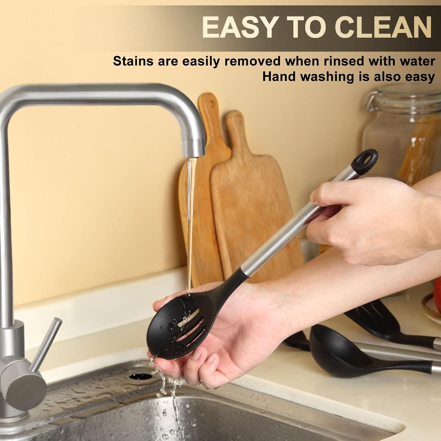 - 【Easy to Clean & Dishwasher Safe】 Our heat resistant silicone cooking utensils are fast, simple and easy to clean. Simply toss these in the dishwasher to wash off any grease or oil in seconds and leave to dry after cleaning. Furthermore, the kitchen utensils set seamless design also avoids residual sewage in the gap after cleaning that give you more peace of mind