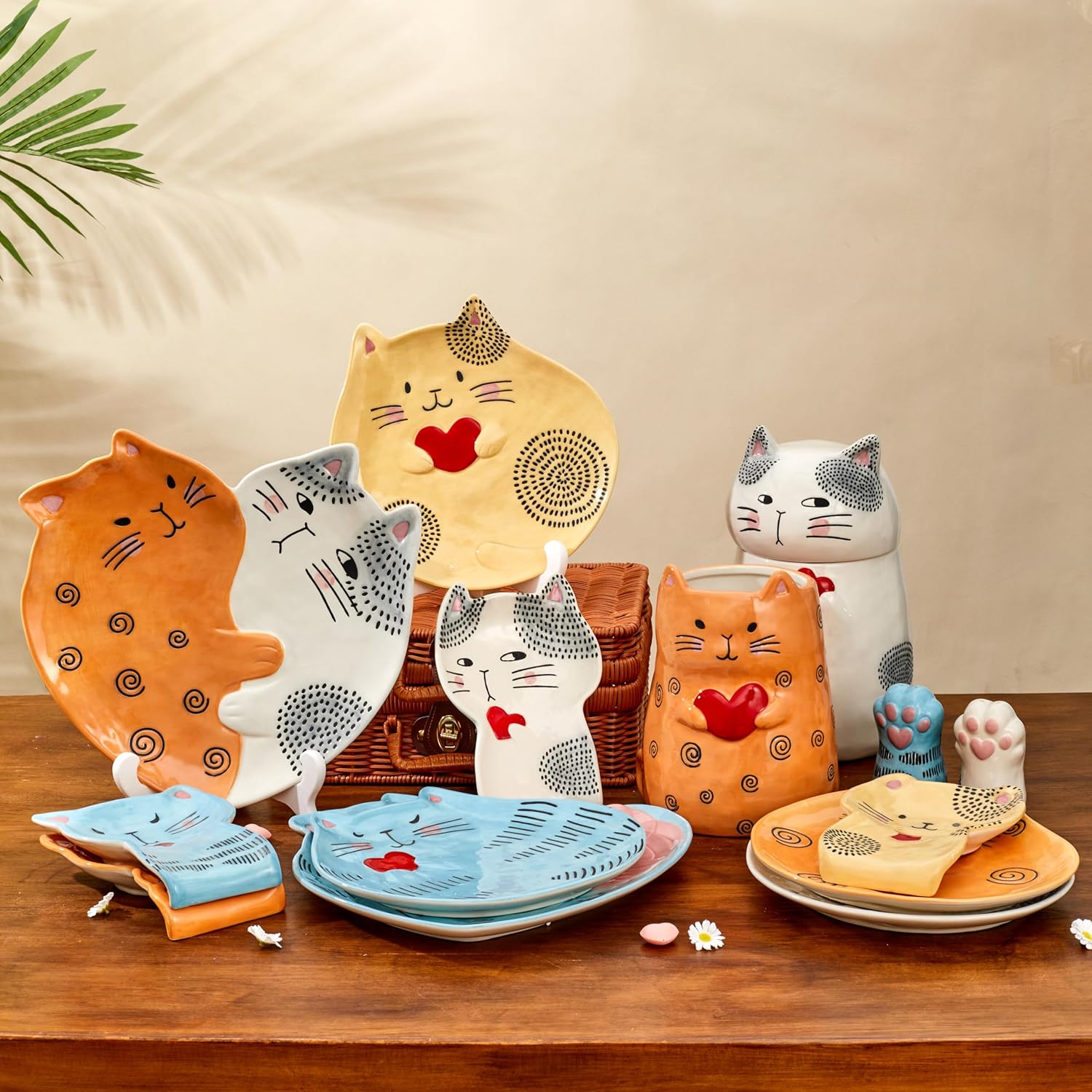 Bico Cartoon Cat Handpainted Stoneware Orange 7.8 inch Utensil Holder, Dishwasher Safe