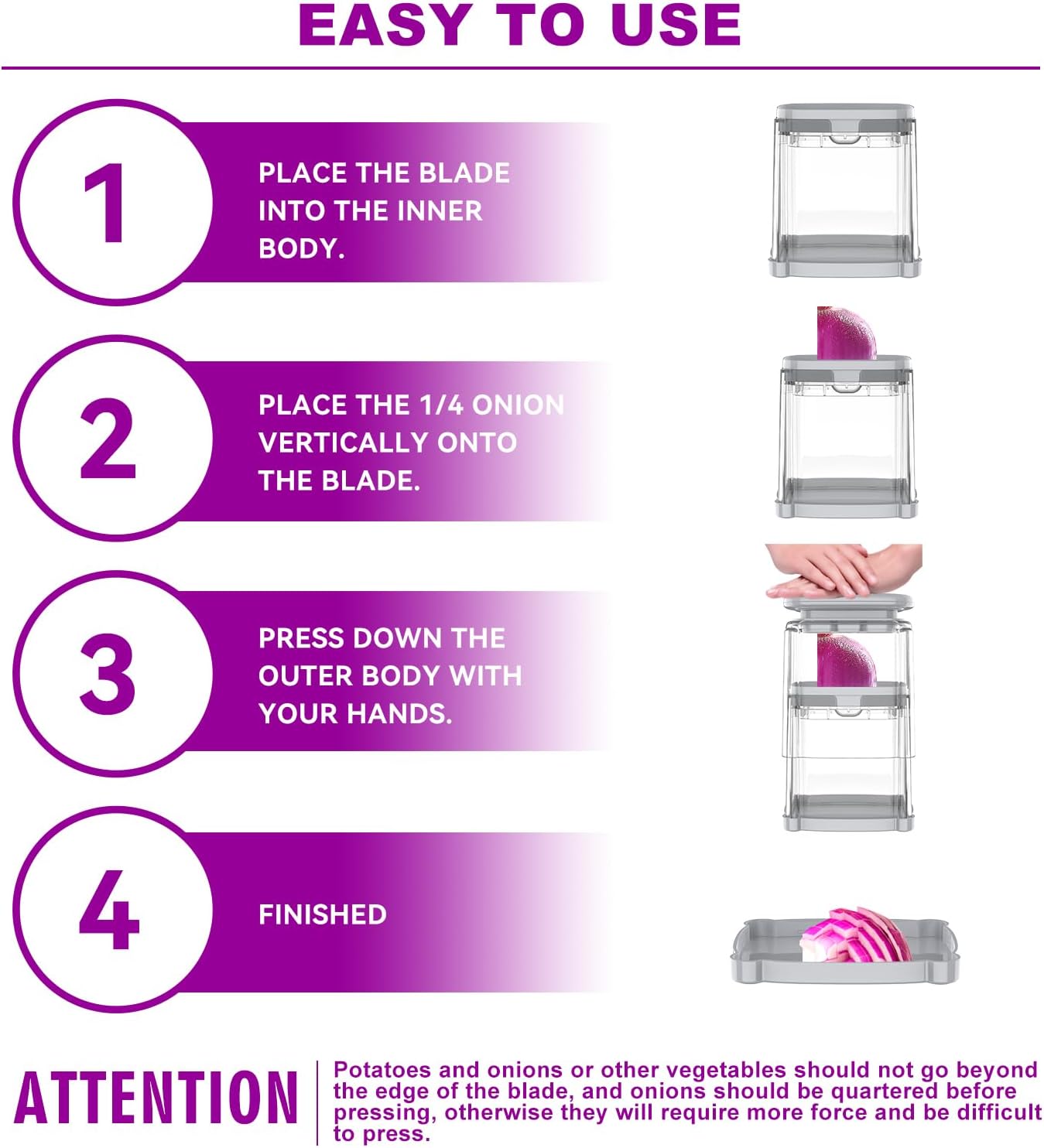 - 【Fruits And Vegetable Slicer】 CrazyQueen onion slicer is designed for fruits and vegetables. This veggie cutter slicer is made of high quality stainless steel, with a sharp and durable blade. This onion slicer is easy to clean, and it is dishwasher safe. ATTENTION: Can't connect the Blade Press Plate with Press Plate directly without the Outer Body, this is the mainly reason that blades won't lock into place.