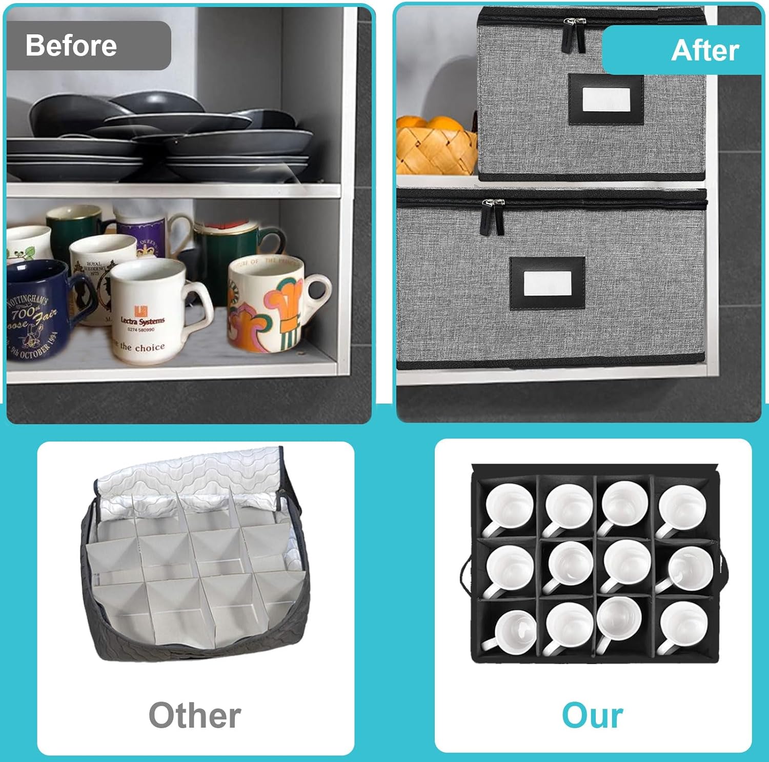 - Product List:Contains 4 Dish Storage Containers and 1 Mug Storage Box.Total 48 Felt Plate Dividers presented.Dish Storage Containers'size:12''*12''*8;10''*10''*8'';8.5''*8.5''*6'';7''*7''*6''.Mug Storage Box's size:17.3''*13''*5.9''.