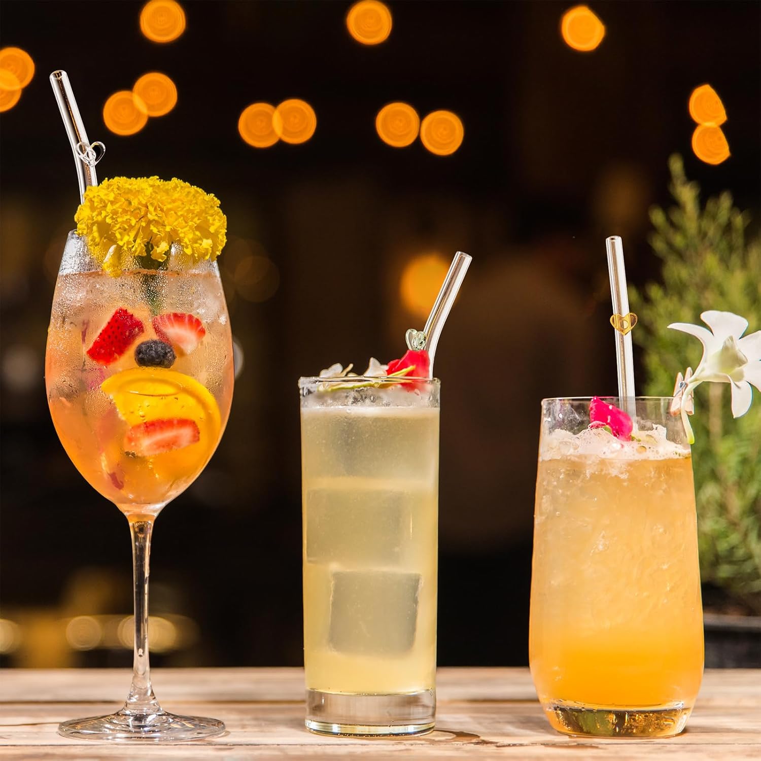 - Our colorful bent glass straws allowing for creative and colorful coordination with your favorite drinks and cups. These aesthetic glass straws work great with all sorts of drinks – sodas, iced beverages, milkshakes, smoothies, water, coffee, milk and cocktails, you name it. Our Clear glass straw is perfect for parties to get-togethers or special events, bringing a laid-back and fun vibe to the scene.