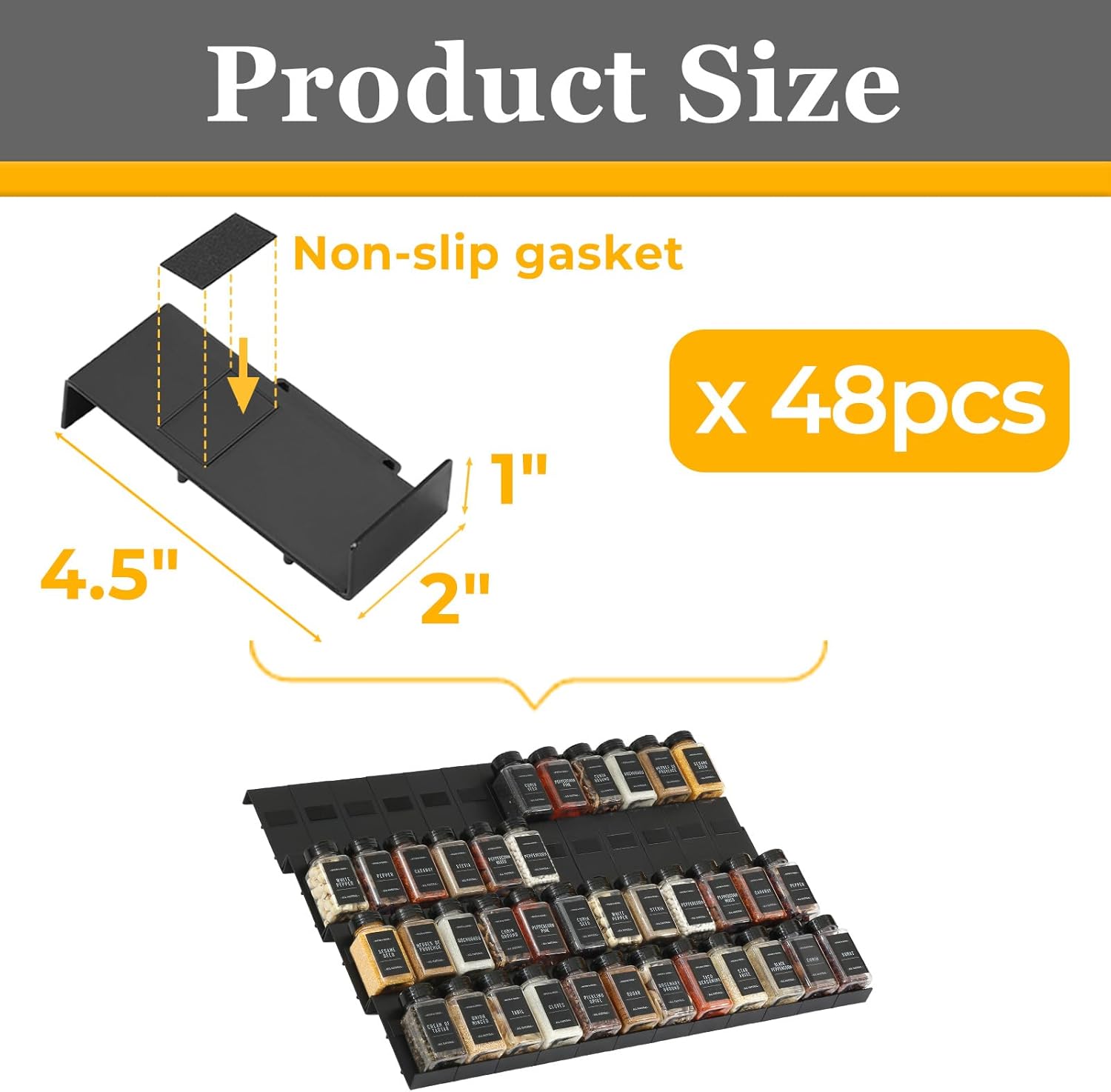 - Durable Plastic Material: Spice rack organizer for cabinet is made of durable plastic. The 48pcs spice tray for drawer is strong and unbreakable, without misshaping. Seasoning organizer although not dishwasher safe, it can be easily cleaned by hand.