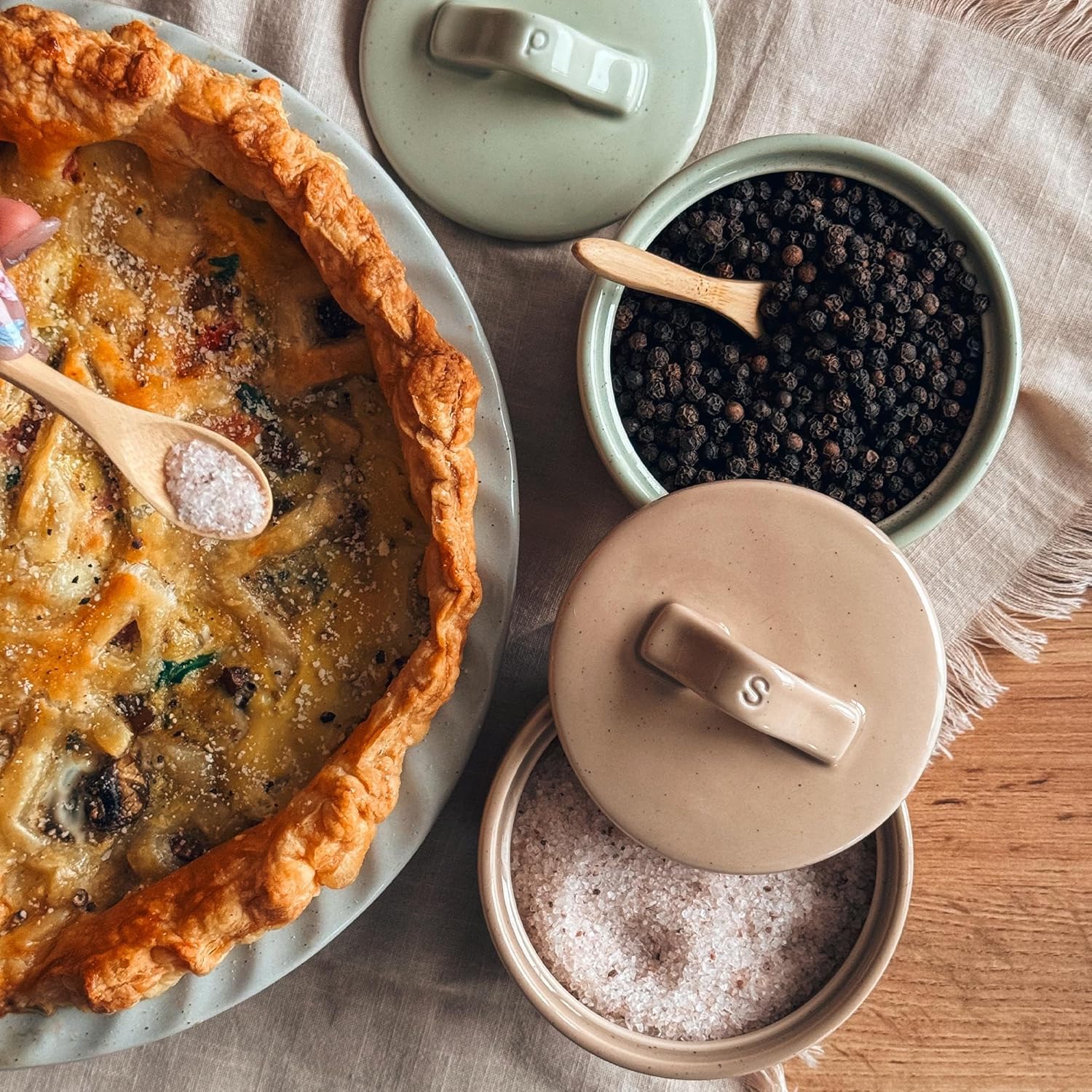 Mora Ceramic Salt and Pepper Cellar Set with Lid - 10 oz Modern Canister/Container/Bowl for Storage, Sea Salt, Spice, Sugar, Countertop - Small Dish/Jar with Wood Spoon, Matcha & Chai Crock