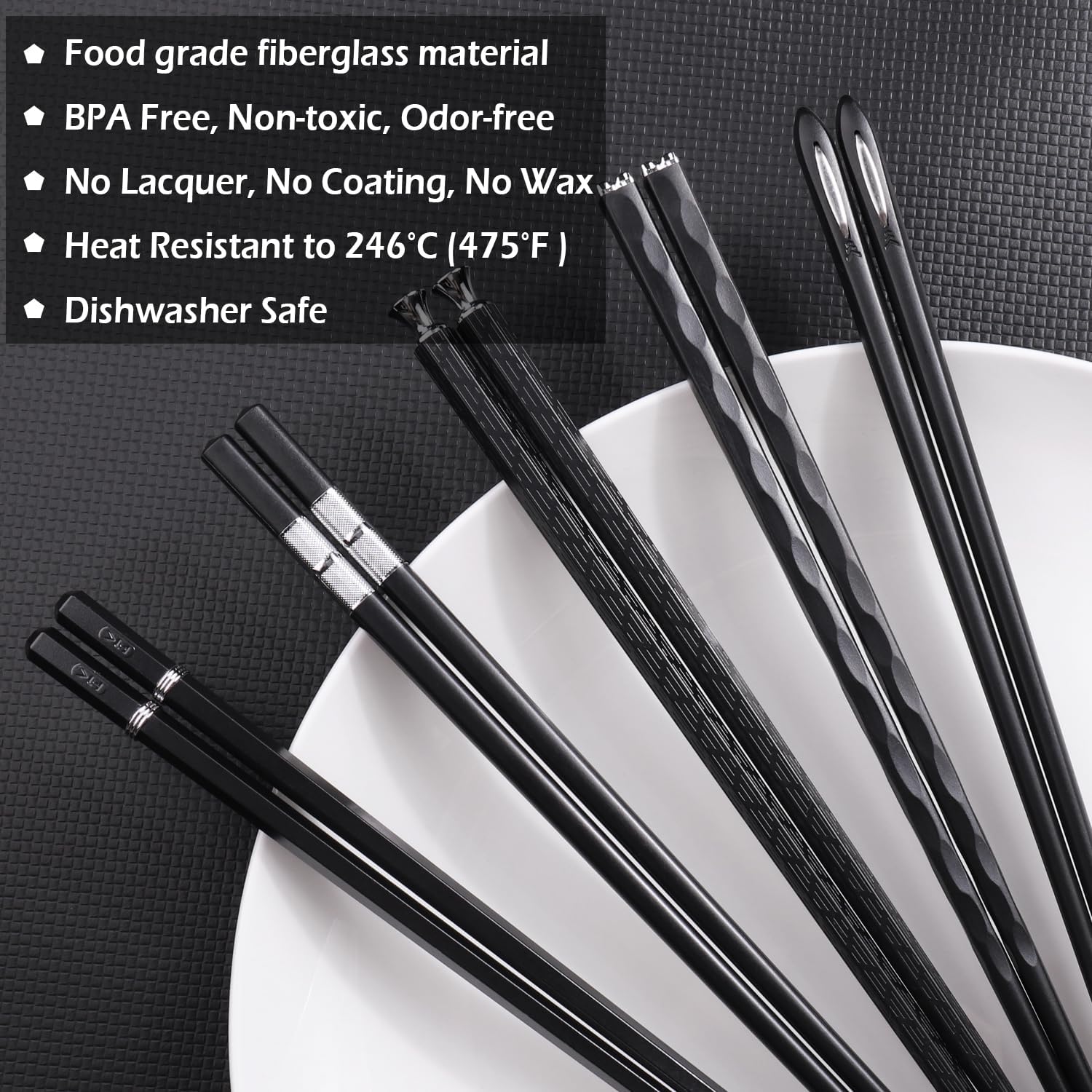 - Healthy & Durable: Unlike low-quality plastic chopsticks that break easily and are unhealthy, Our chopsticks are made of high-quality heat-resistant fiberglass, which avoids the metallic taste of metal chopsticks, the burr of wooden chopsticks. Additionally, they are BPA-Free with no coating or painting.