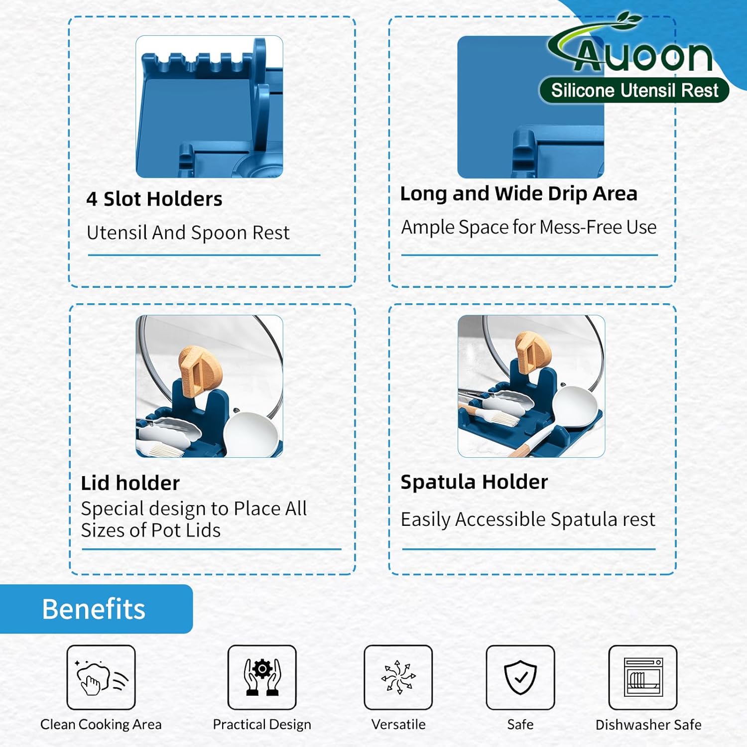 - 【Keep Your Countertop Clean】AUOON spoon and lid rest is a must-have for a tidy kitchen. It neatly holds your utensils and pot lid, preventing oil and water from splattering everywhere. Enjoy a clean and organized cooking space