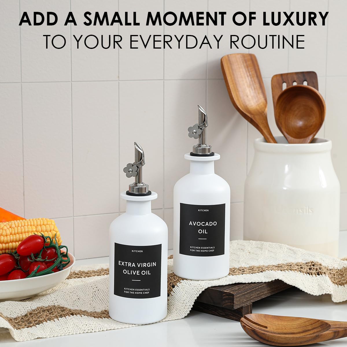 - KITCHEN ESSENTIAL - Worthy of sitting on your kitchen counter, The olive oil bottle dispenser for kitchen with label which can help you identify them easily, both decorative and practical, this oil dispenser bottles not only kitchen oil dispenser, but also black and white kitchen décor.