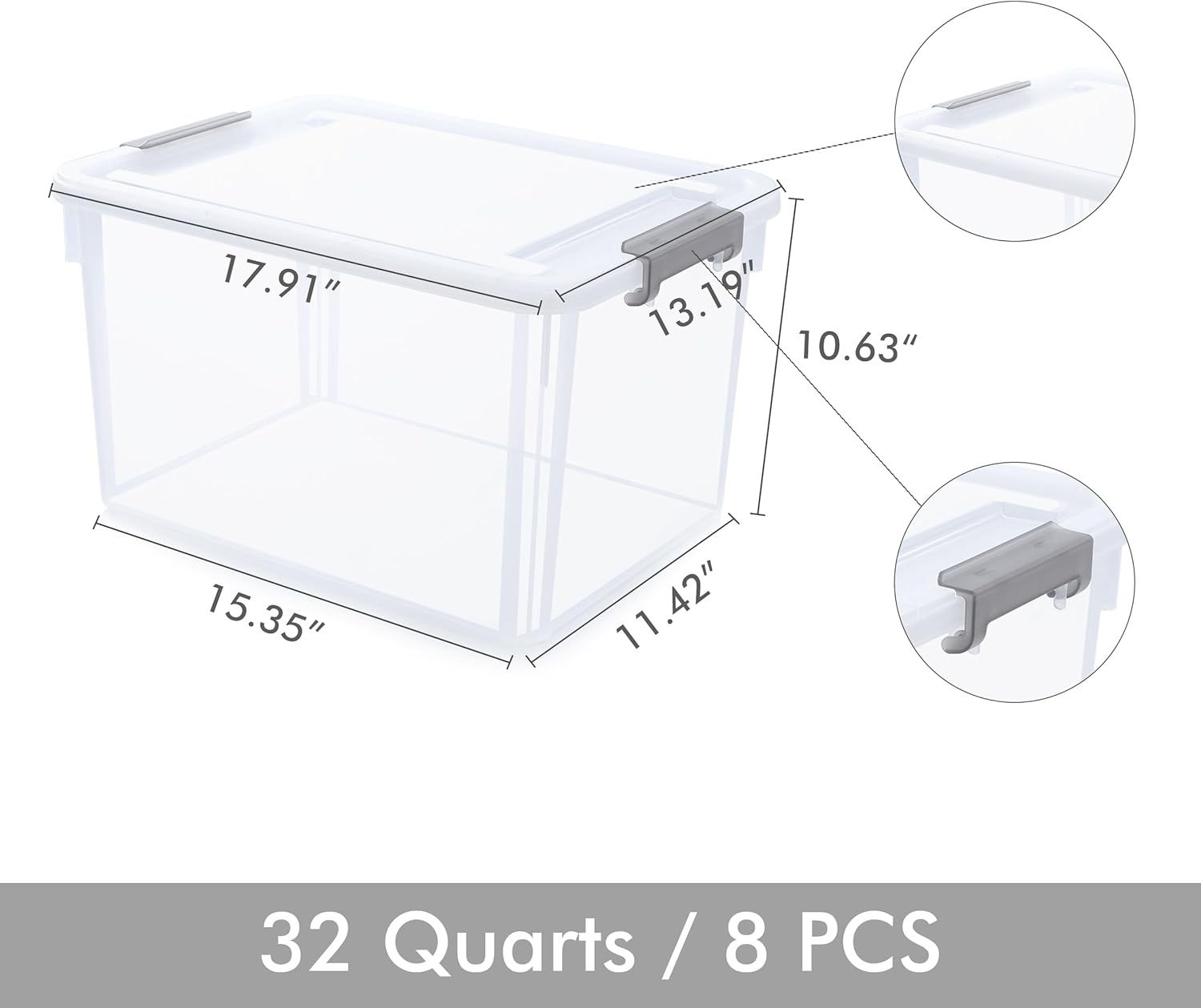 - 【32-quart Capacity】Package includes 8 containers for organizing, single measuring 17.91"L * 13.19"W * 10.63"H, capacity 32 QT. Suitable for large storage needs in the closet, garage, bedroom, basement, camping, office, etc
