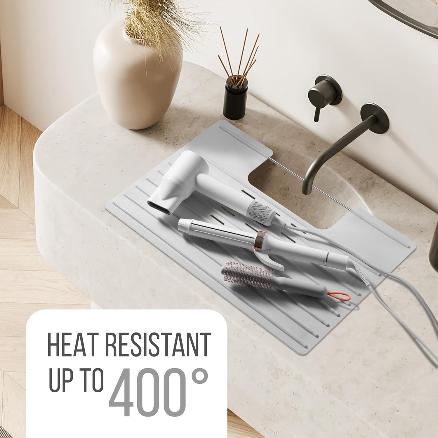 - Heat-Resistant Surface: Protect your bathroom surfaces from hot hair tools with this bathroom sink mat. Capable of withstanding temperatures up to 400 degrees, it ensures your surfaces remain undamaged